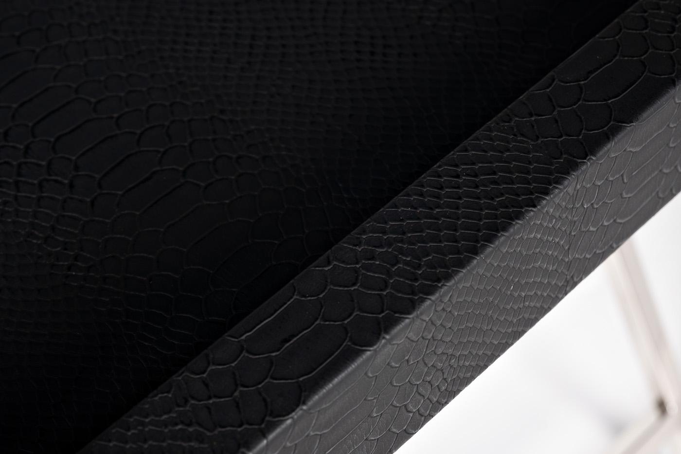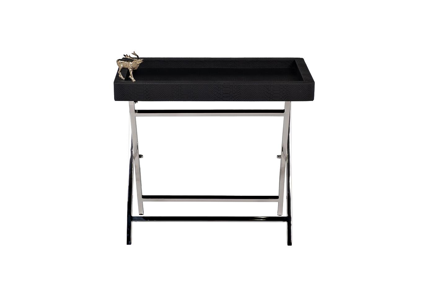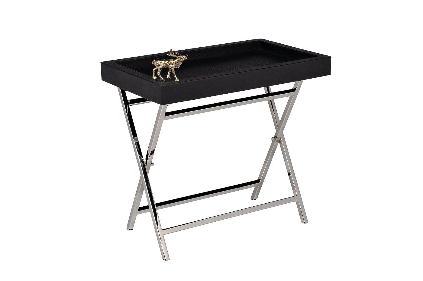 description-full - Красивый сервировочный стол выполнен из сочетания материалов – металла, МДФ и кожи, что придает ему аристократичной статусности. В данной модели воплощены лучшие черты современного стиля: четкая геометрия, минимализм, лаконичность и функциональность. Столешница обита натуральной кожей, черного оттенка, который эффектно сочетается с металлическими ножками под серебро. Уникальная особенность модели – ее стильное и оригинальное украшение, представленное миниатюрной фигуркой лося с золотистым напылением. Заказать стильный журнальный столик можно онлайн в интернет-магазине Garda Decor.