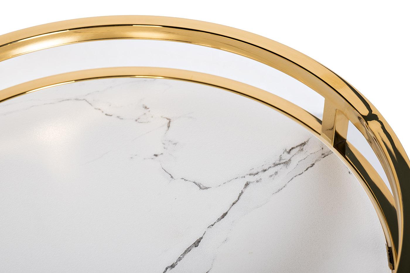 description-full - Дизайнерский журнальный столик со стеклом несет в себе большую декоративную нагрузку. В качестве столешницы выступает закаленное стекло с полимерным покрытием с эффектом «под мрамор». А основание из позолоченного металла делает круглый журнальный столик по-настоящему роскошным предметом обстановки. Конструкция выглядит визуально легкой и воздушной, но при этом она устойчивая и прочная благодаря металлическому каркасу. Журнальный золотой столик оригинального дизайна прекрасно впишется в современный интерьер в стиле ар-деко, неоклассика, контемпорари, минимализм. Толщина столешницы - 8мм, высота от пола 50см. Этот элегантный столик доступен к заказу на сайте Garda Decor с доставкой по Москве и РФ.