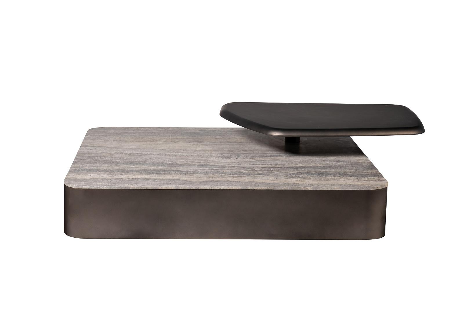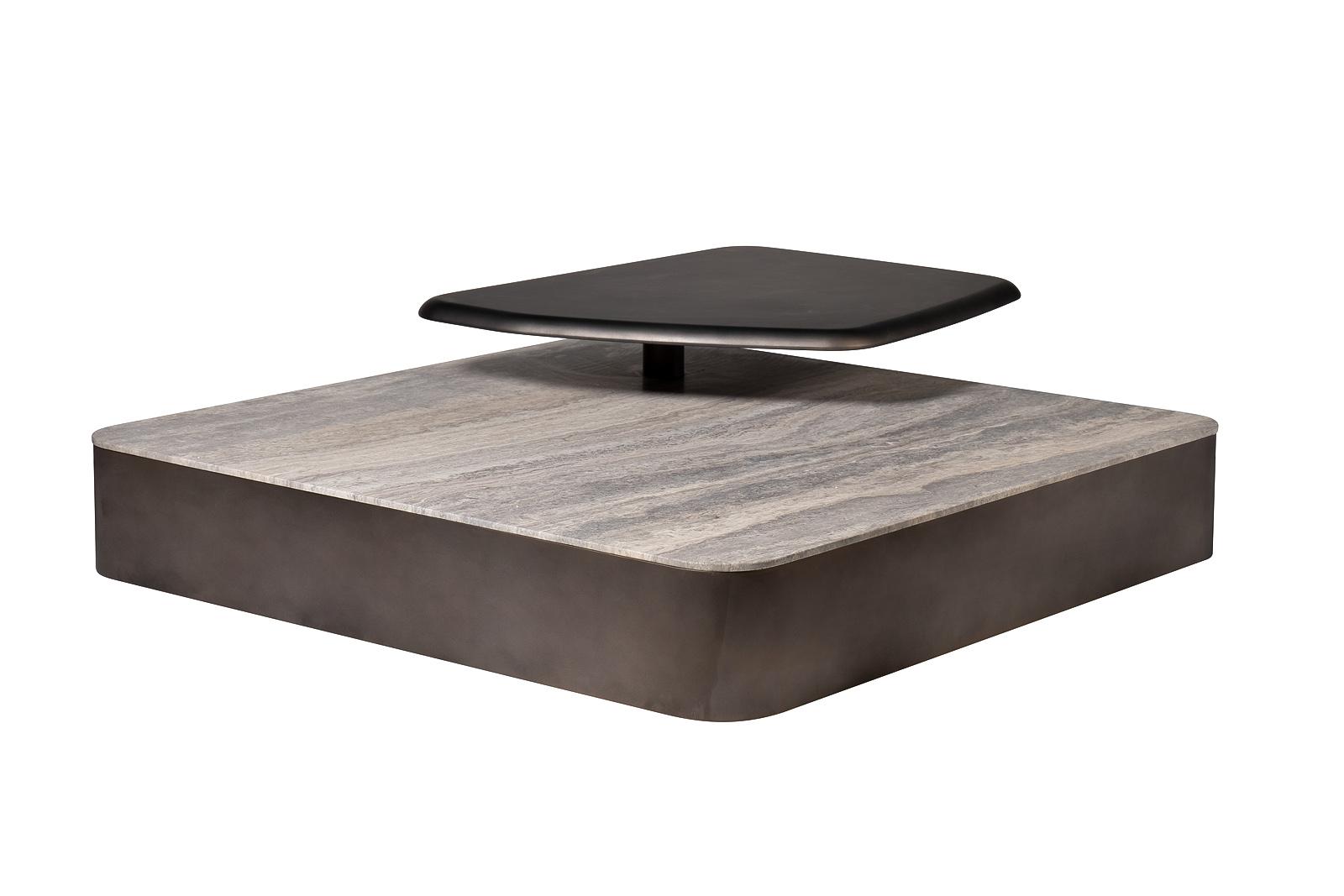 description-full - Этот квадратный мраморный журнальный стол с полкой — не просто функциональный элемент, а выверенная архитектурная форма, способная стать центром притяжения любого пространства. Его массивная столешница из натурального травертина с уникальным узором, напоминающим застывшие реки, придает предмету монументальность и природную глубину. Основание, выполненное из шлифованного металла, создает строгий контраст, подчеркивая благородство камня. Над основной плоскостью расположена дополнительная полка из металла, которую можно повернуть в разные стороны. Её асимметричная форма и темный оттенок добавляют композиции динамики и многослойности, предлагая нетривиальное решение для размещения декора или книг. Этот предмет идеально впишется в современные интерьеры, где ценятся смелые сочетания материалов, скульптурные формы и функциональная эстетика. Стол является воплощением дизайна, который гармонично объединяет природную мощь камня и строгость металла, создавая пространство, наполненное характером и...