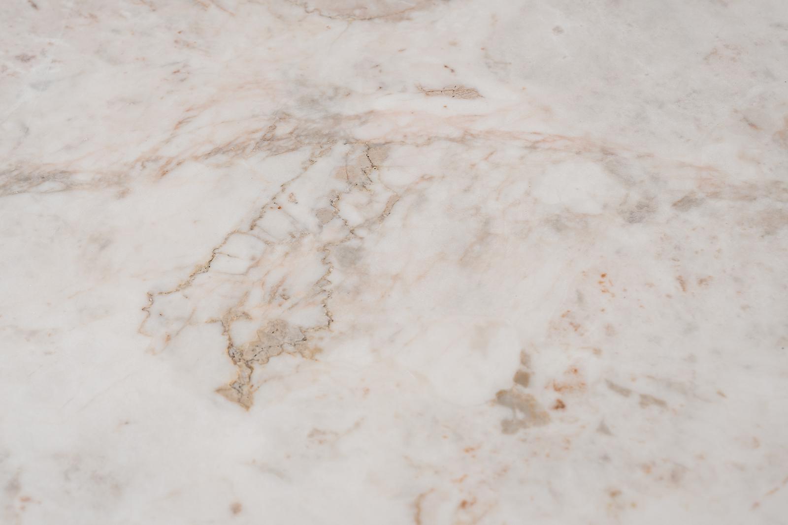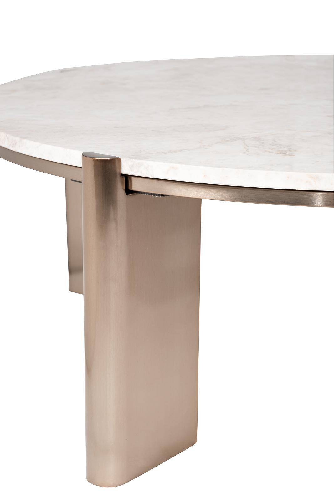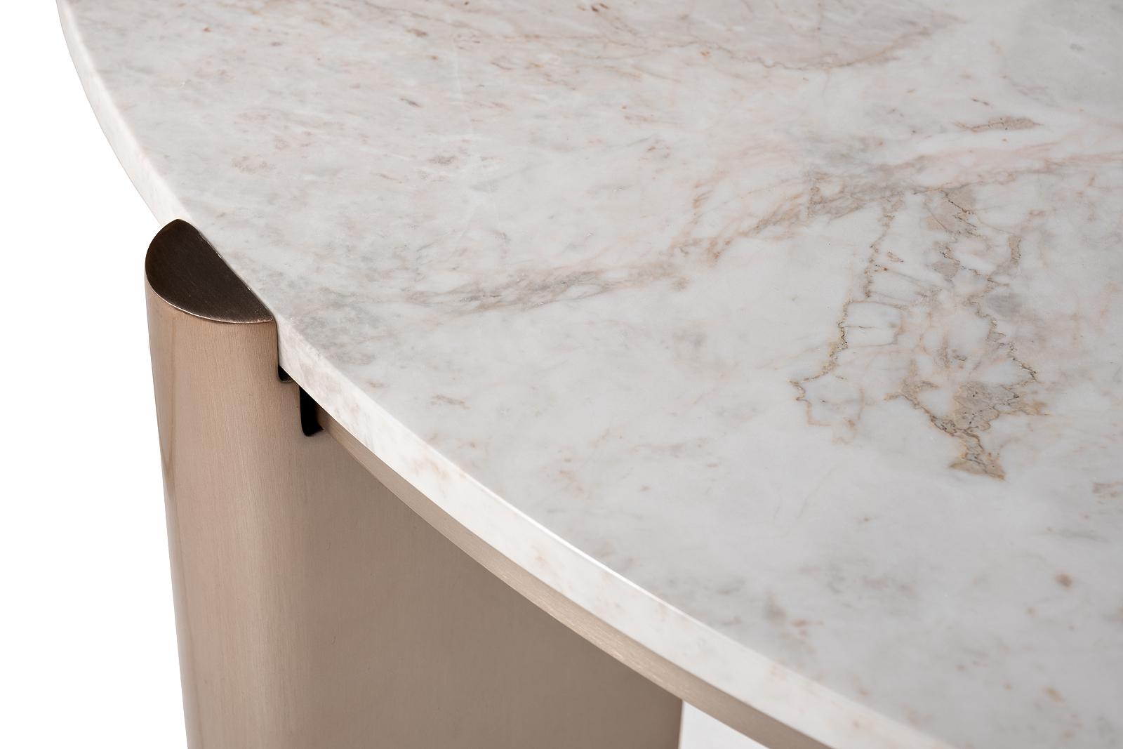 Невысокий журнальный стол из природного полированного белого мрамора на четырех опорах прямоугольного сечения из брашированной нержавеющей стали с благородным оттенком золота-шампань. Опоры немного выступают на периметр окружности столешницы, в трендах со...
