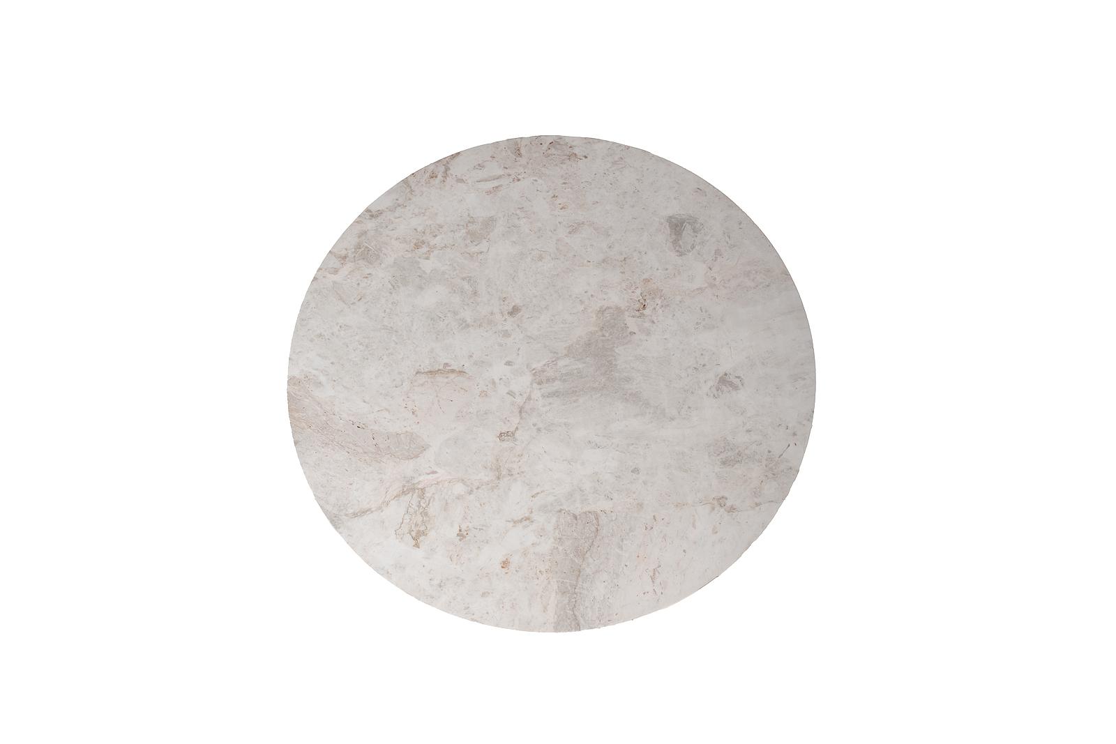 description-full - Невысокий журнальный стол из природного полированного белого мрамора на четырех опорах прямоугольного сечения из брашированной нержавеющей стали с благородным оттенком золота-шампань. Опоры немного выступают на периметр окружности столешницы, в трендах современных дизайнерских решений. Толщина столешницы: 18мм, диаметр 100см Сочетается со столиком 57EL-10083