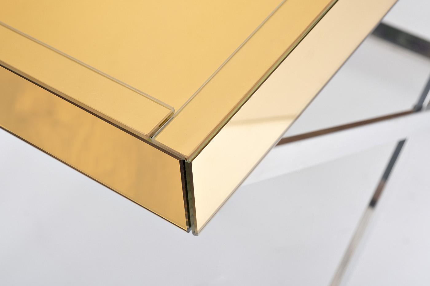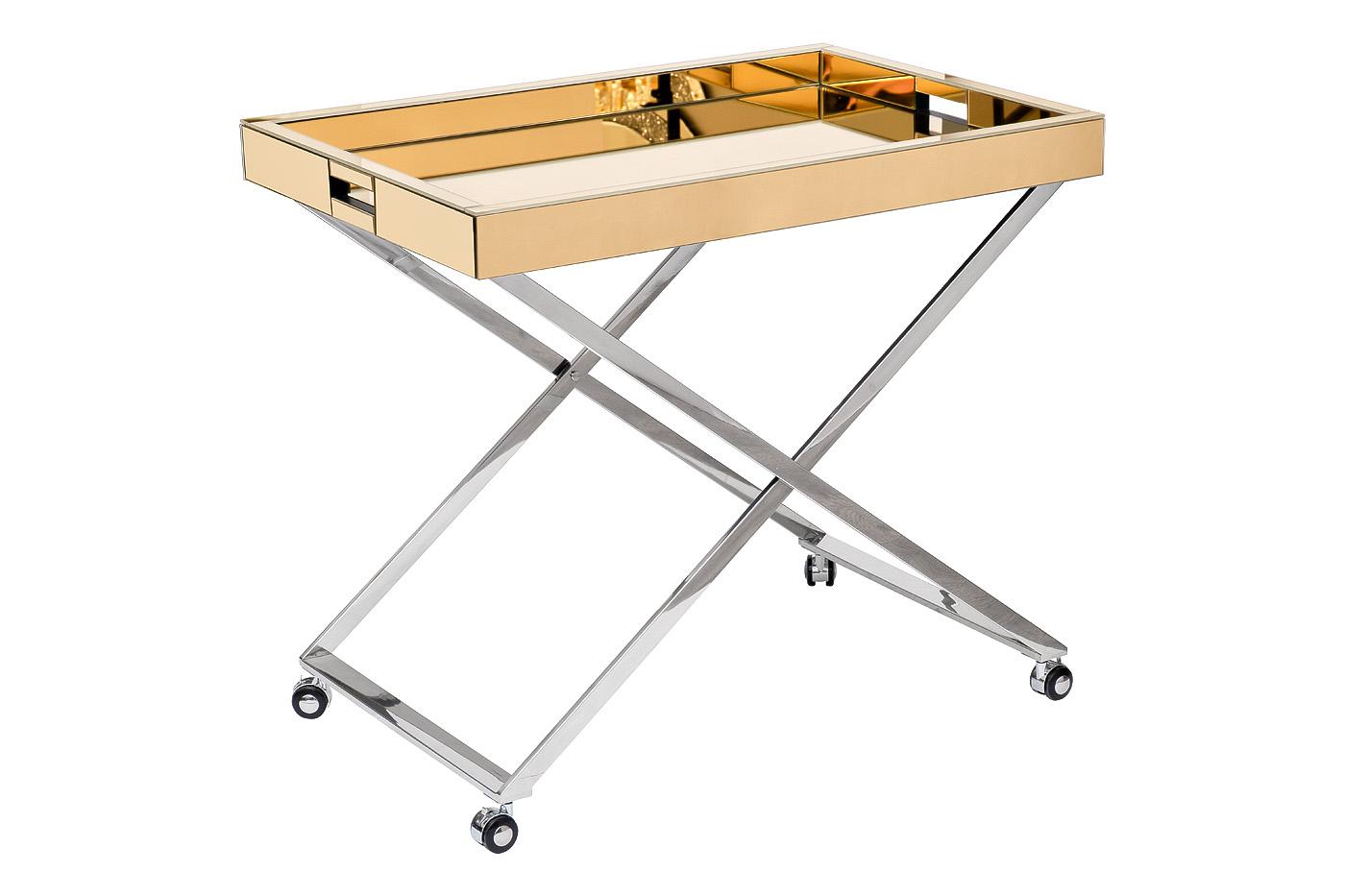 description-full - Роскошный сервировочный стол в современном стиле отлично справляется не только со своими прямыми функциями, но и может использоваться в качестве декоративного акцента в интерьере. Сочетание блестящей хромированной стали с зеркальными поверхностями делает этот оригинальной столик на колесах изящным украшением гостиной, столовой, спальни. Он визуально легкий и элегантный, мобильный за счет конструкции и небольших колесиков. Металлический каркас с золотым покрытием особенно выигрышно смотрится в интерьерных стилях ар-деко, авангард, шебби-шик, классика, модерн. На сайте Garda Decor вы можете купить зеркальный стол вместе с другой мебелью и элементами декора в аналогичной стилистике.