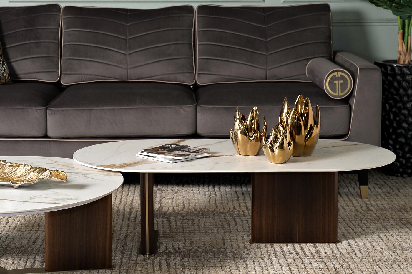 description-full - Овальный журнальный стол – стильная и лаконичная мебель, которая будет особенно гармонично смотреться в классическом интерьере или стиле арт-деко. Модель привлекает внимание своим современным дизайнерским решением. Журнальный стол с мраморным принтом, выполненный в изысканных белых тонах, заслуживает внимания и обязательно станет любимым элементом в вашем интерьере. Он может использоваться в качестве самостоятельного изделия, а также в тандеме с другим журнальным из этой коллекции. Элегантный овальный столик для гостиной или зоны отдыха, в котором сочетаются три стихии - камень, дерево и металл. Столешница изготовлена из прессованного при высокой температуре керамогранита, что обеспечивает высокую степень надежности и износостойкости. Опоры из древесной плиты высокого давления (HDF) с отделкой из шпона, с акцентом на золотое основание. Толщина столешницы - 12мм. Сочетается с круглым столиком 76AR-501C-STOL/ZH