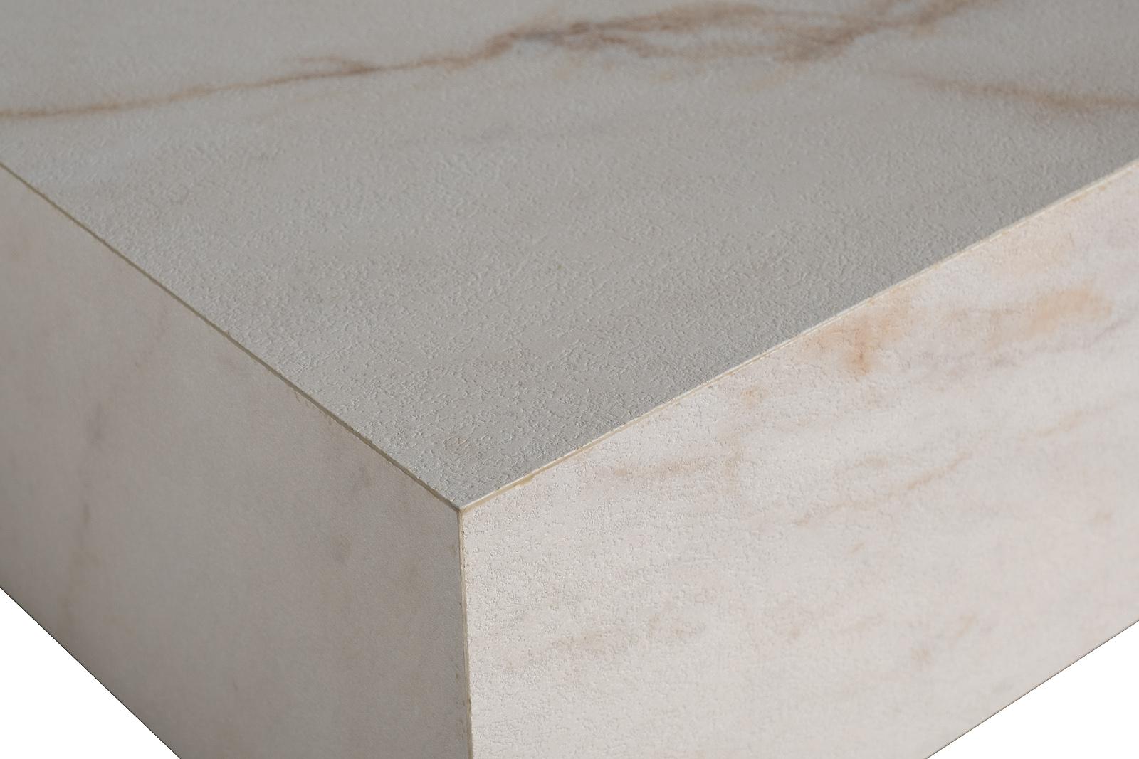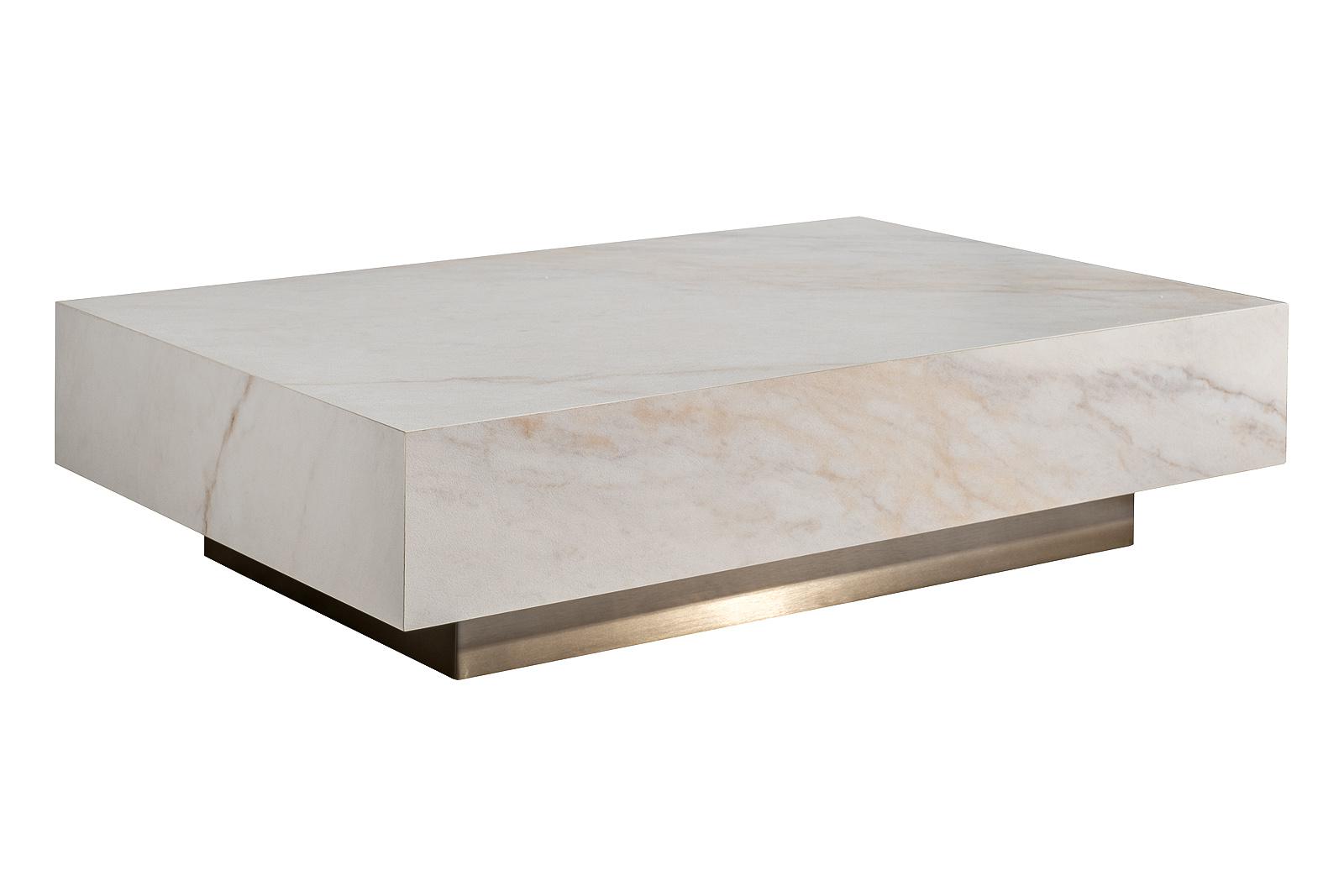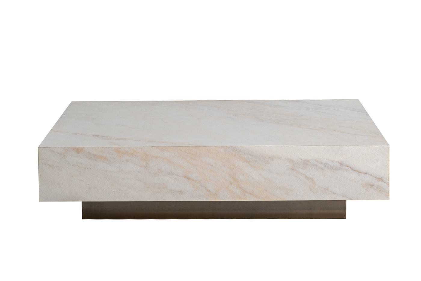 description-full - Простая форма этого журнального стола смотрится стильно благодаря облицовке из керамики под мрамор. Большая поверхность светлого тона притягивает взгляд и вместе с тем позволяет сервировать изысканную трапезу в зоне отдыха, расставить изящные интерьерные предметы, не боясь при этом повредить покрытие. Внутренний каркас изготовлен из МДФ, а основание - из нержавеющей стали.