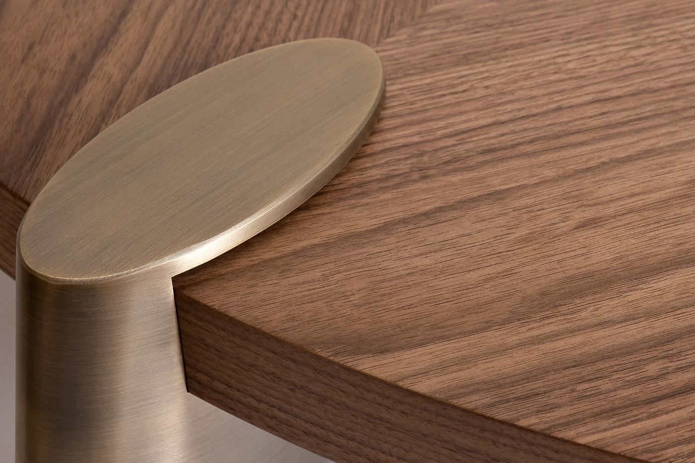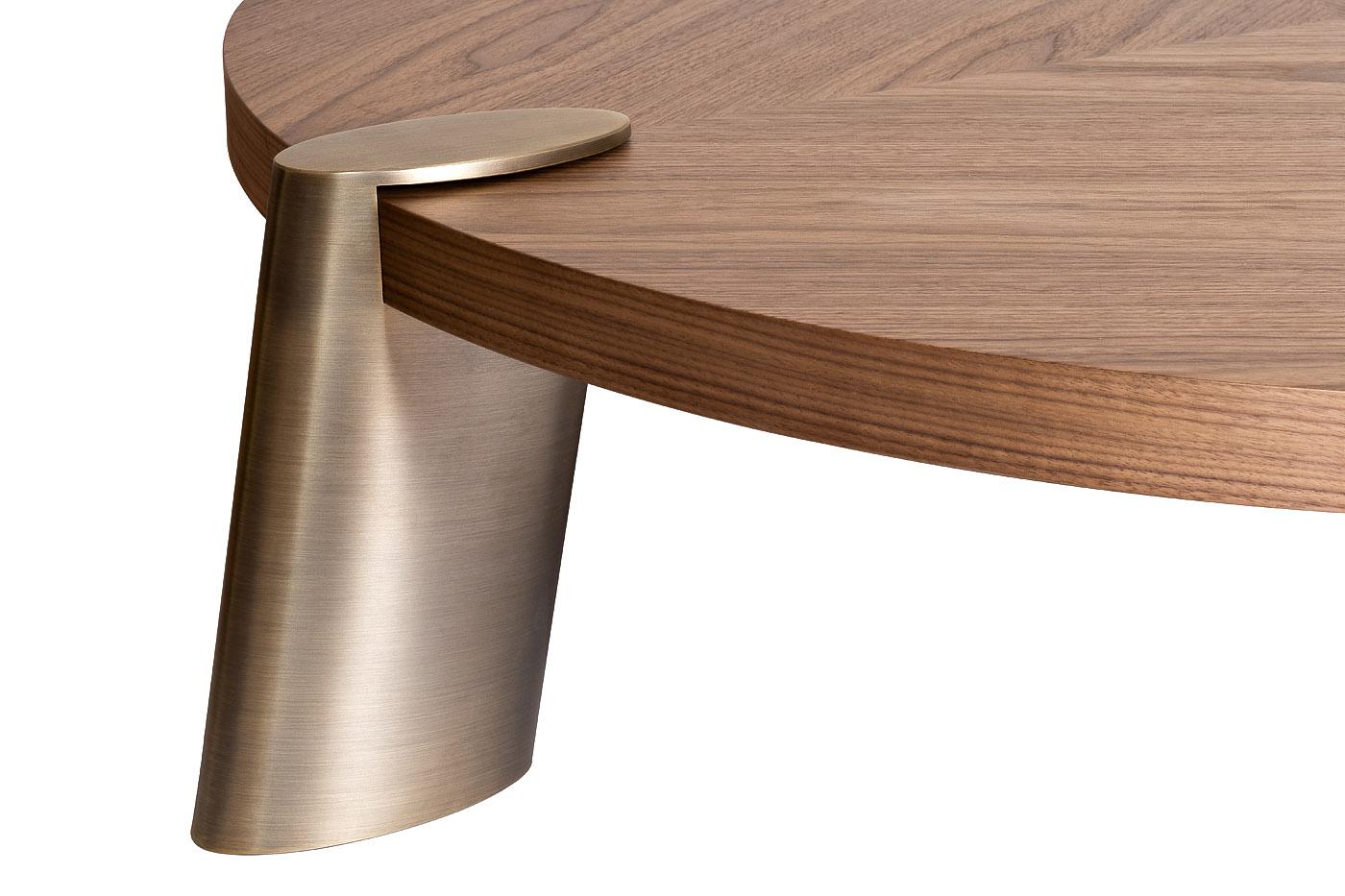 description-full - Необыкновенно стильный журнальный стол Конг (Kong) от бельгийского дизайнера Тома Де Вульфа стал хитом продаж в Европе. В процессе его создания автора вдохновляла отделка суперсовременных автомобилей люксовых марок. Три массивные стальные ножки цвета латуни имеют устойчивую обтекаемую форму и благородный шелковистый блеск, достигаемый шлифовкой металла вручную. Шпонированная столешница из светлого ореха выглядит дорого и изящно. Сдержанные линии, скругленные формы, лаконизм в деталях сочетаются с высоким качеством материалов и отделки. Необычные пропорции притягивают взгляд и без слов говорят о том, что этот предмет мебели - авторская работа известного дизайнера. Стол впишется в современный интерьер кабинета или гостиной, станет роскошным дополнением к стильному дивану или креслам.