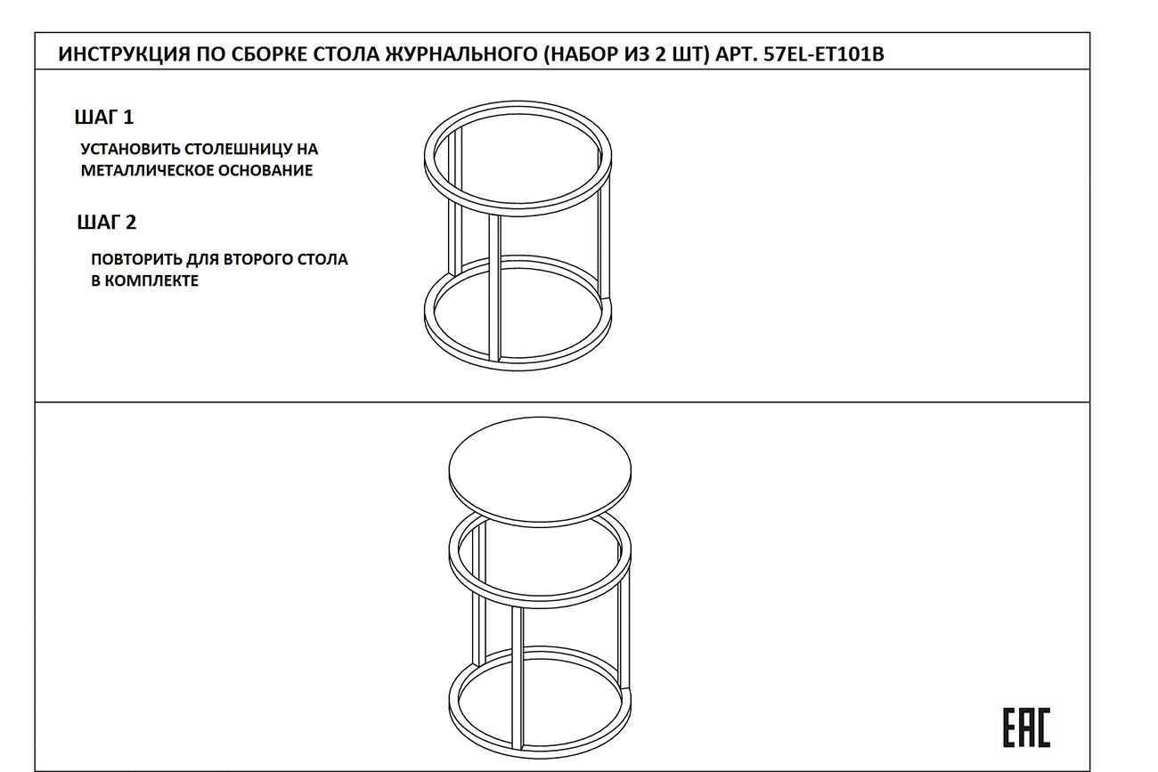 description-full - Комплект журнальных столов для гостиной – удачный выбор для посиделок с друзьями или семьей. Предметы сделаны по принципу матрешек. Эти круглые журнальные столы немного различаются размерами. В результате один из них удобно задвигается под другой, экономя пространство. При необходимости столики можно раздвинуть, если у вас намечаются гости. Такой набор журнальных столов выглядит необычайно стильно и презентабельно. Мебель выполнена со вкусом, отвечает современным требованиям качества. В состав входит нержавеющая сталь и искусственный мрамор. Высокое качество материалов обуславливает длительную эксплуатацию предметов интерьера без потери их качеств. Максимальная нагрузка на большой столик - 30кг, на маленький - 25кг. Размеры столов - 60х60х63, 47х47х55 Комплект столов в таком же дизайне, но в большем размере - арт. 57EL-CT101А.