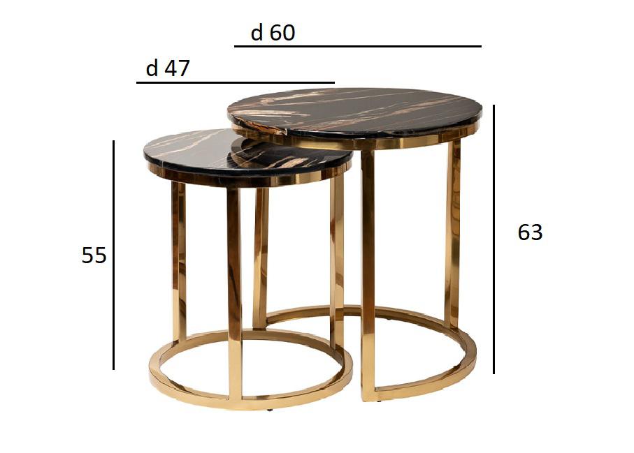description-full - Стильный комплект журнальных столиков станет отличным выбором для гостиной, кабинета, спальни. Конструкция модели весьма интересная – два журнальных столика различны по размерам, поэтому меньший легко задвигается и экономит пространство. При необходимости вы получаете сразу два стола, а значит в два раза больше места для сервировки. Дизайнерский набор журнальных столиков выглядит элегантно и презентабельно за счет сочетания столешниц под мрамор с каркасом из нержавеющей стали золотого цвета. Размеры столов - 60х60х63, 47х47х55 Комплект столов в таком же дизайне, но в большем размере - арт. 57EL-CT101А-BL.