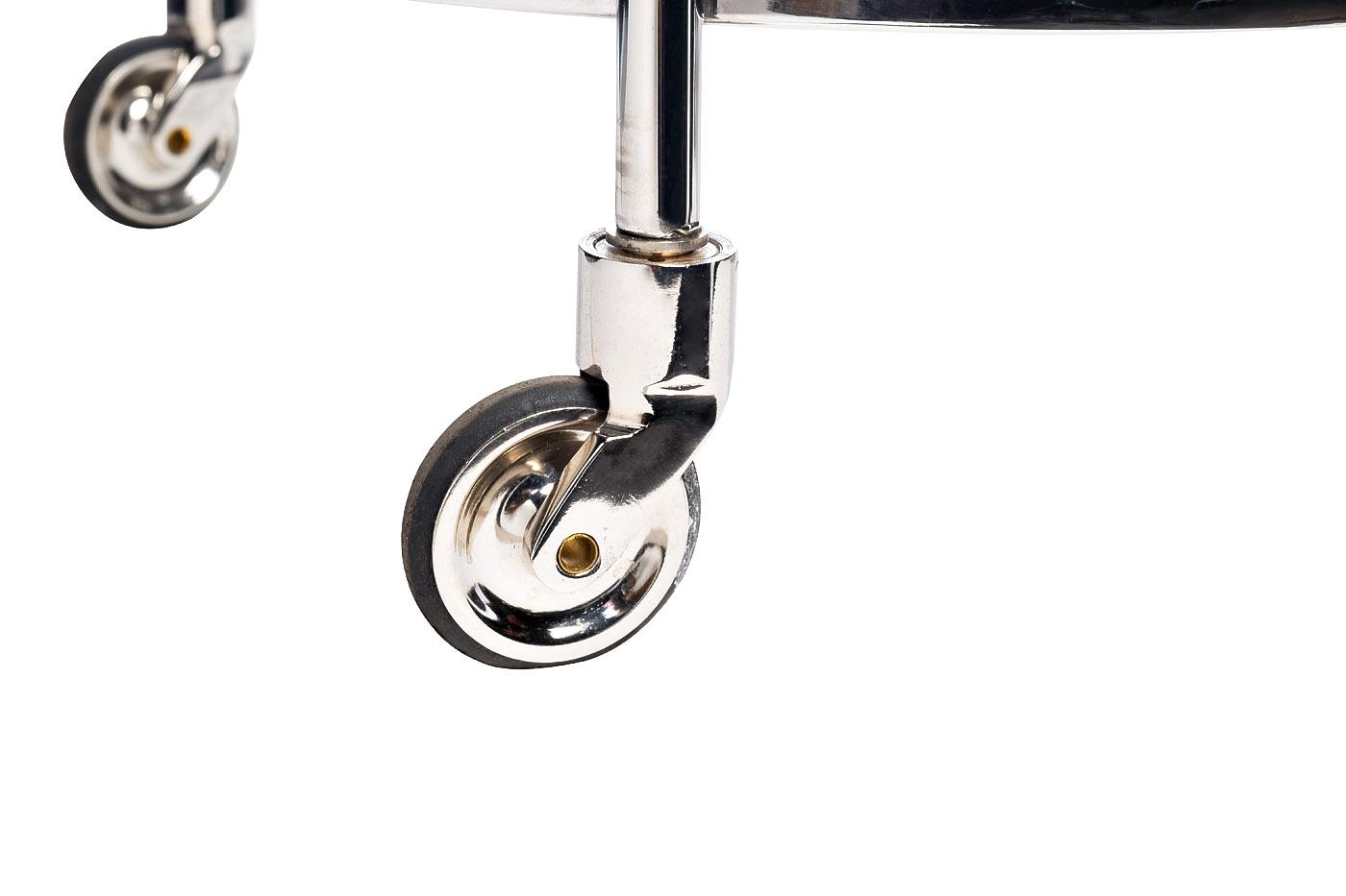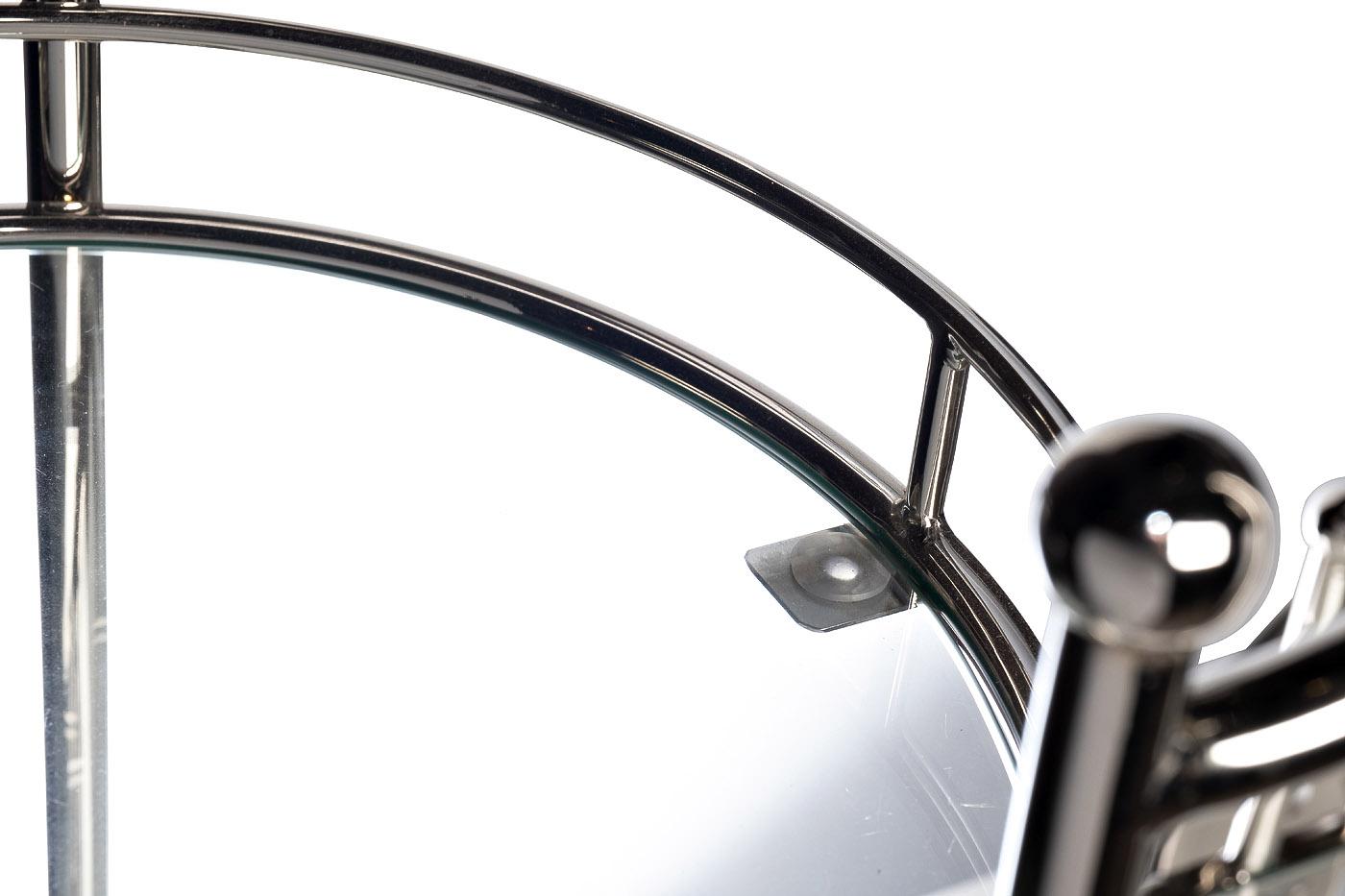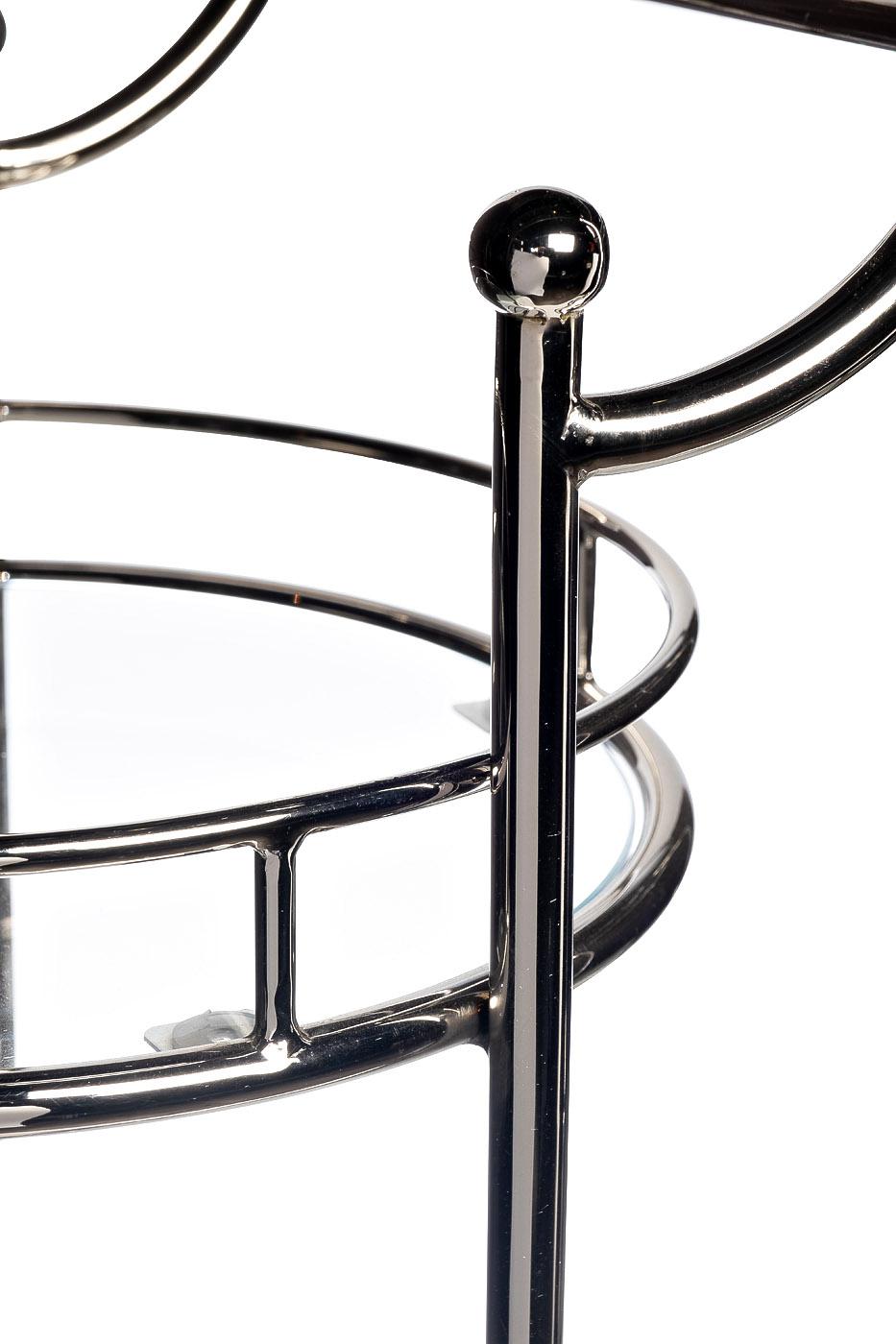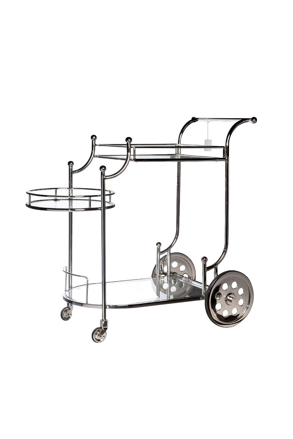 description-full - Элегантная сервировочная тележка в стиле ар-деко: плавные линии, воздушность, сочетание стекла и металла. Все детали вместе придают изделию легкость, изящество и функциональность. Двухъярусная сервировочная тележка оригинальной формы имеет три полки. На них разместятся закуски и вино; отдельно можно поставить тарелку с фруктами или сладостями. Тележка может стать практичным и очень стильным элементом декора комнаты. Массивные задние колеса служат делают тележку устойчивой во время движения, а маленькие передние придают маневренность.