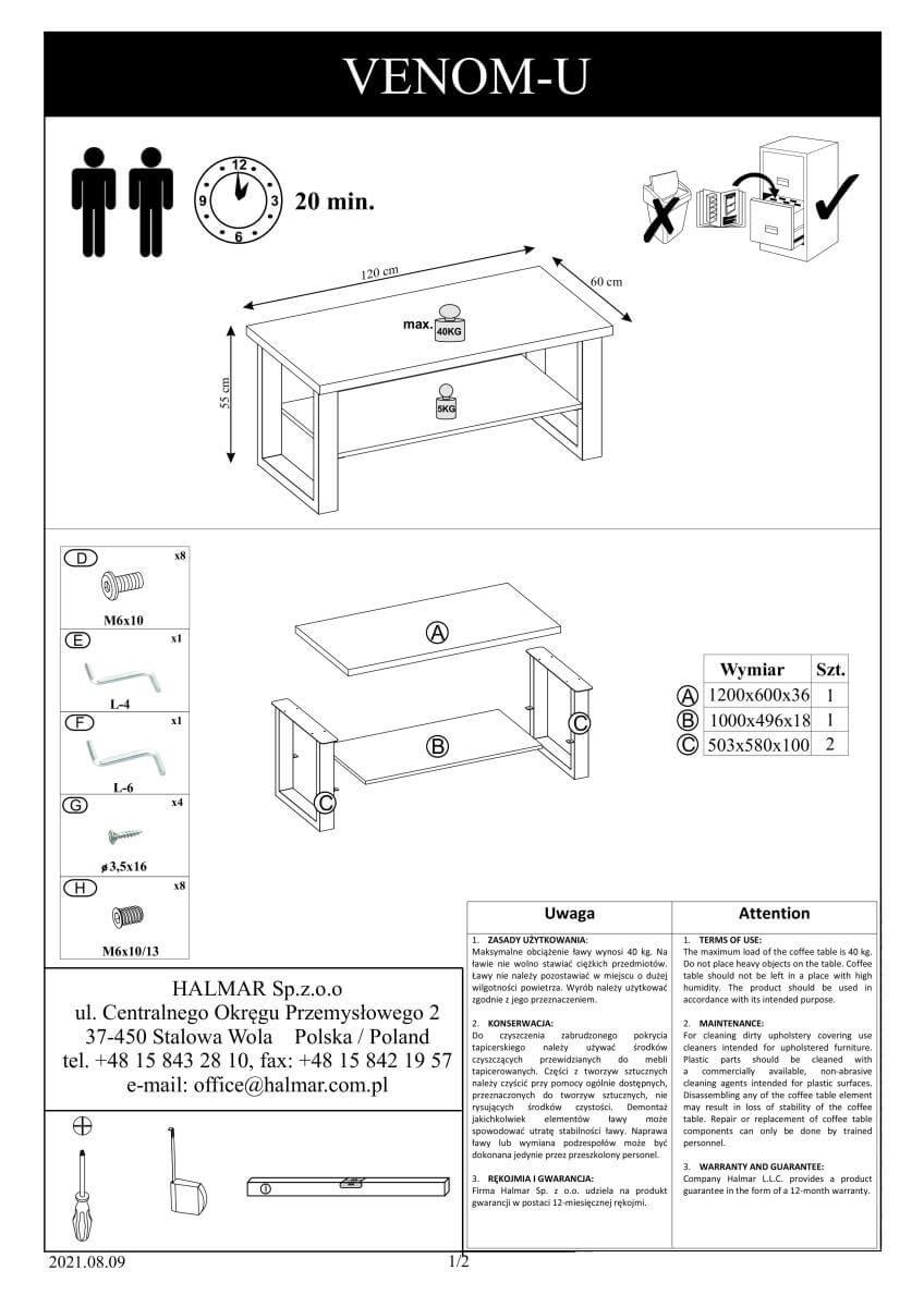 Вес, кг: 33 кг / Высота (см): 55 / Гарантия, мес.: 24 месяца / Длина (см): 60 / Материал каркаса: металл / Материал столешницы: ЛДСП / Раздвижной: нет / Страна производитель: Польша / Форма столешницы: прямоугольник / Цвет столешницы: коричневый / Ширина (см): 120