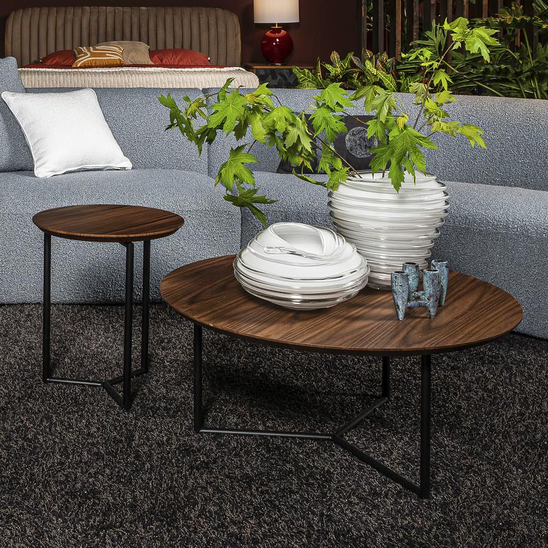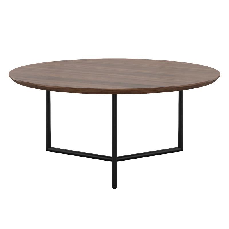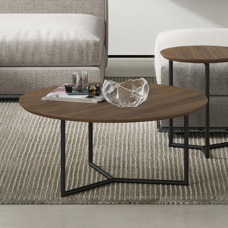 Круглый журнальный стол Miramar в современном стиле на металлических ножках. Рисунок натурального шпона всегда индивидуален, что делает эту модель неповторимой. Столешница выполнена из высококачественного, сертифицированного МДФ высокой плотности. Отделка - натуральный шпон северо-американского ореха. Ножки выполнены из метала и окрашены в черный матовый цвет.