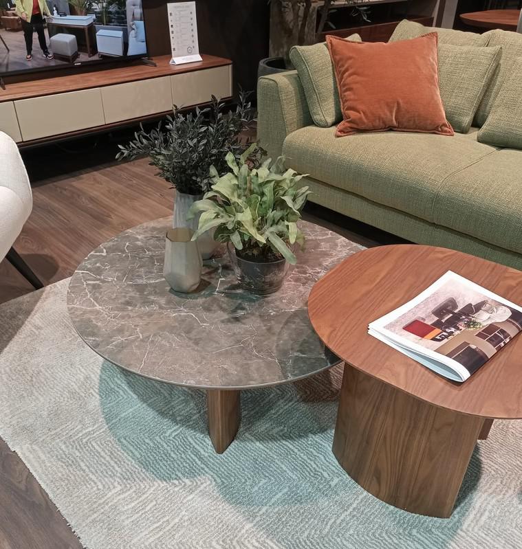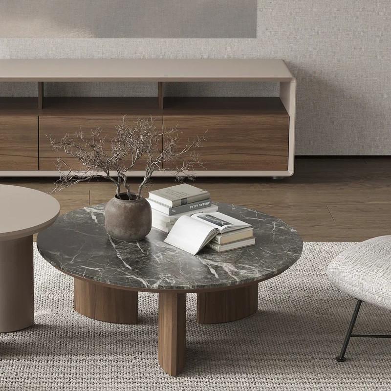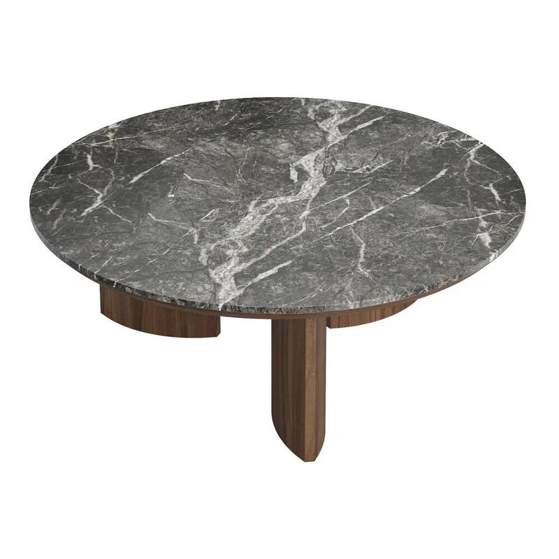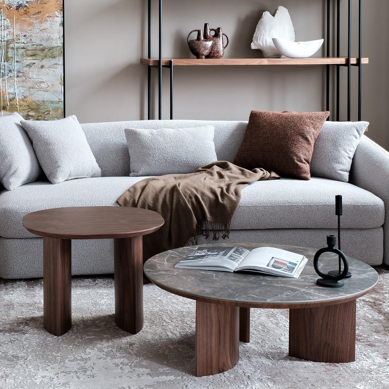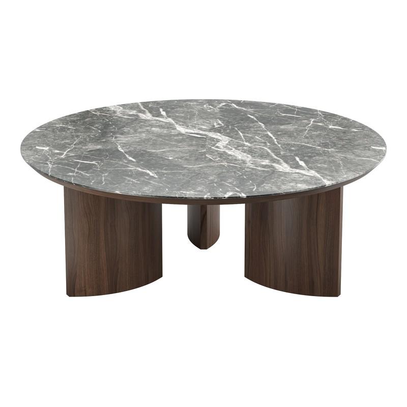Круглый журнальный стол Miramar от бренда MOD Interiors в современном стиле. Три ножки в форме лодки придают столу еще более плавных форм. подстолье и ноги стола выполнены из высококачественного, сертифицированного МДФ высокой плотности. Отделка – натуральный шпон северо-американского ореха. Рисунок натурального шпона всегда индивидуален. Столешница - керамика в серых тонах.