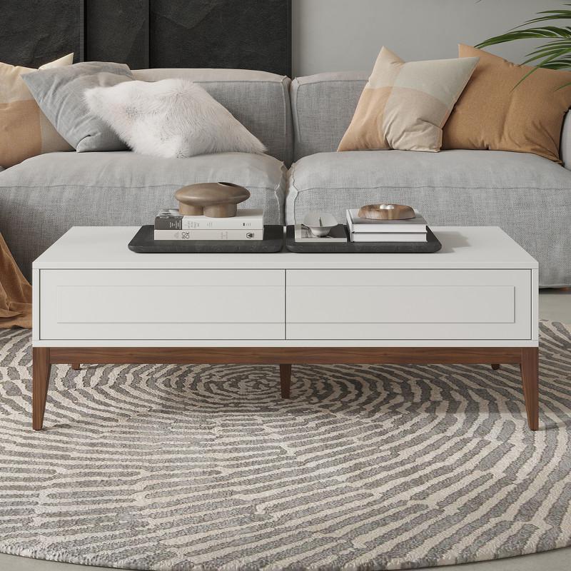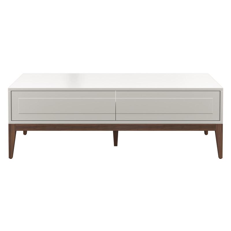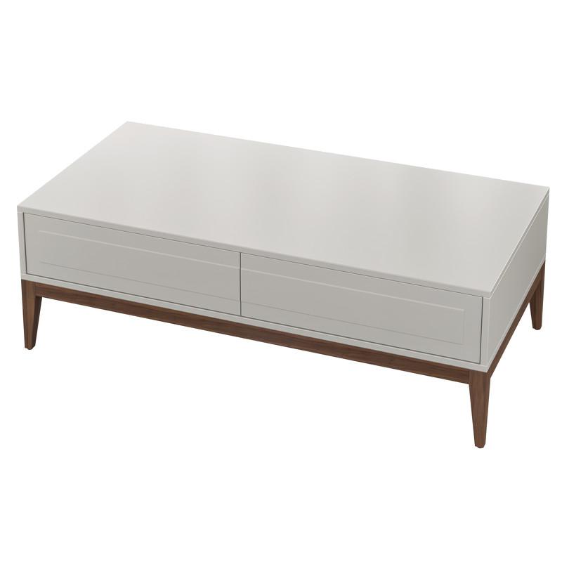 Журнальный стол с двумя большими ящиками на высоких ножках из коллекции Marbella от испанского бренда MOD Interiors. Дизайнерская фрезеровка фасадов в лаконичном стиле придает ему завершенный вид. Столешница и корпус комода выполнены из высококачественного сертифицированного МДФ высокой прочности в отделке матовый лак светло-серого оттенка. База комода изготовлена из массива дерева с покрытием из натурального шпона ореха. Два ящика оснащены системой легкого открывания push-to-open. Качественный и долговечный механизм. Стол оснащен дополнительной ножкой по центру.