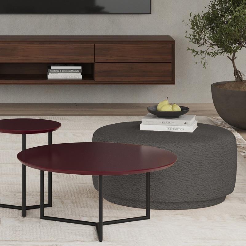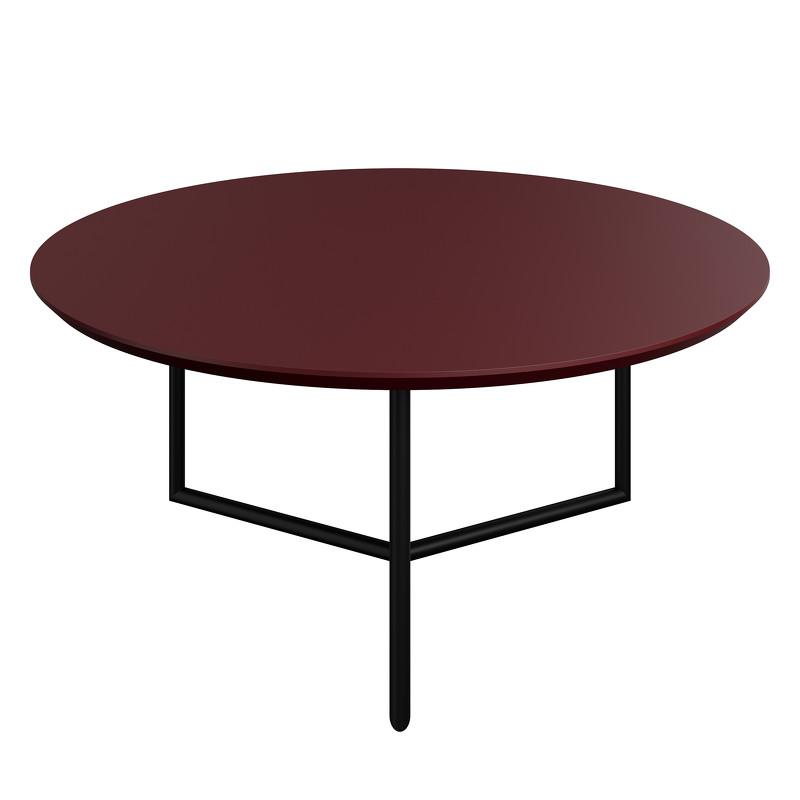 Акцентный круглый журнальный стол Miramar от бренда MOD Interiors в современном стиле на металлических ножках. Столешница выполнена из высококачественного, сертифицированного МДФ высокой плотности, в отделке - матовый лак роскошного винного оттенка. Ножки выполнены из метала и окрашены в черный матовый цвет.