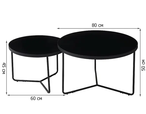 Вес, кг: 21,2 / Высота (см): 50 / Высота 2-о товара в комплекте (см): 45 / Гарантия, мес.: 12 / Глубина (см): 80 / Глубина 2-о товара в комплекте (см): 60 / Количество коробок: 2 / Материал каркаса: металл / Материал столешницы: стекло / Необходимость сборки: да / Раздвижной: нет / Размер упаковки 1: 0,82/0,85/0,085 / Размер упаковки 2: 0,62/0,65/0,08 / Страна производитель: Китай / Форма столешницы: круг / Цвет каркаса: черный / Цвет столешницы: черный / Ширина (см): 80 / Ширина 2-о товара в комплекте (см): 60