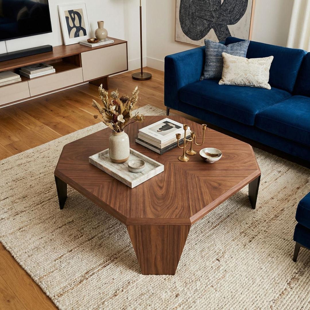 Журнальный столик Nidji — это выразительный арт-объект, который задает тон интерьеру. Его ключевая особенность — нестандартная восьмиугольная форма: классический квадрат со срезанными углами, придающая модели легкость и графичность. Благодаря идеальным пропорциям и живой текстуре дерева, этот стол будет естественным центром притяжения в гостиной или эффектным акцентом в лобби отеля. h3Столешница/h3 Столешница из МДФ, покрыта натуральным шпоном ореха. Благородный рисунок древесины подчеркивает геометрию стола, создавая игру природных линий. Оттенок — тёплый орех с характерными переливами от медово-коричневого до глубокого шоколадного*. *Важно учитывать: В зависимости от освещения в помещении и настроек вашего монитора цветопередача может отличаться. При дневном свете текстура выглядит более контрастной, при тёплом вечернем освещении — становится глубже и насыщеннее. h3Опора и каркас/h3 Архитектурная чистота линии достигнута за счет цветового единства: ножки в тон столешнице делают конструкцию визуально цельной. Основание из стали с матовым порошковым покрытием создает надежный «фундамент». Специальные регулируемые опоры на ножках позволяют установить столик идеально ровно на любом покрытии, будь то плитка, паркет или ковролин. h3Гарантия/h3 Стол поставляется в разобранном виде. На все соединения и материалы распространяется гарантия 12 месяцев.