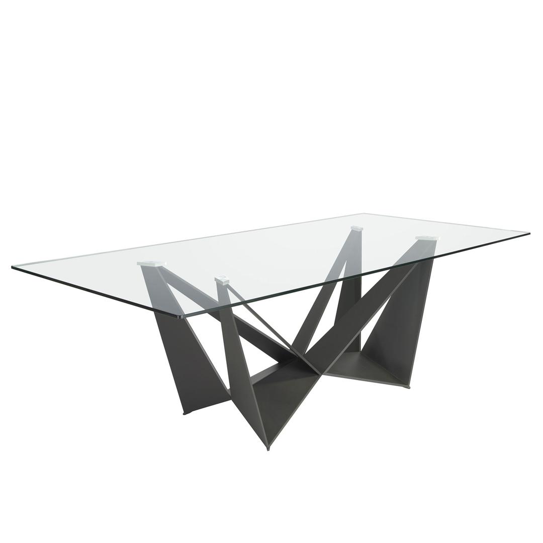 Обеденный стол с фиксированной столешницей из закаленного стекла и черной конструкцией из нержавеющей стали.