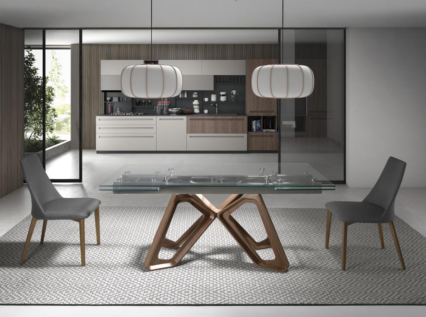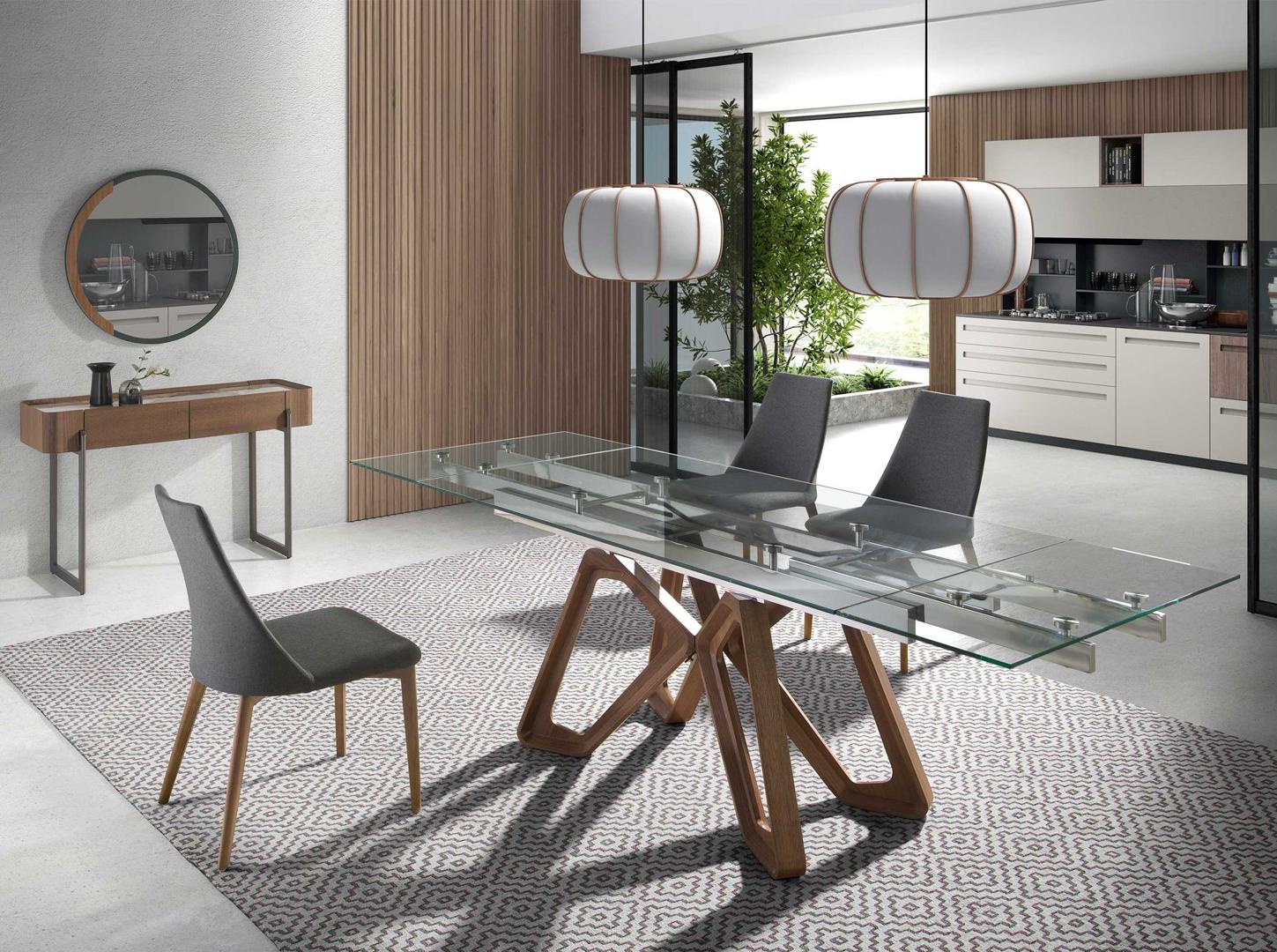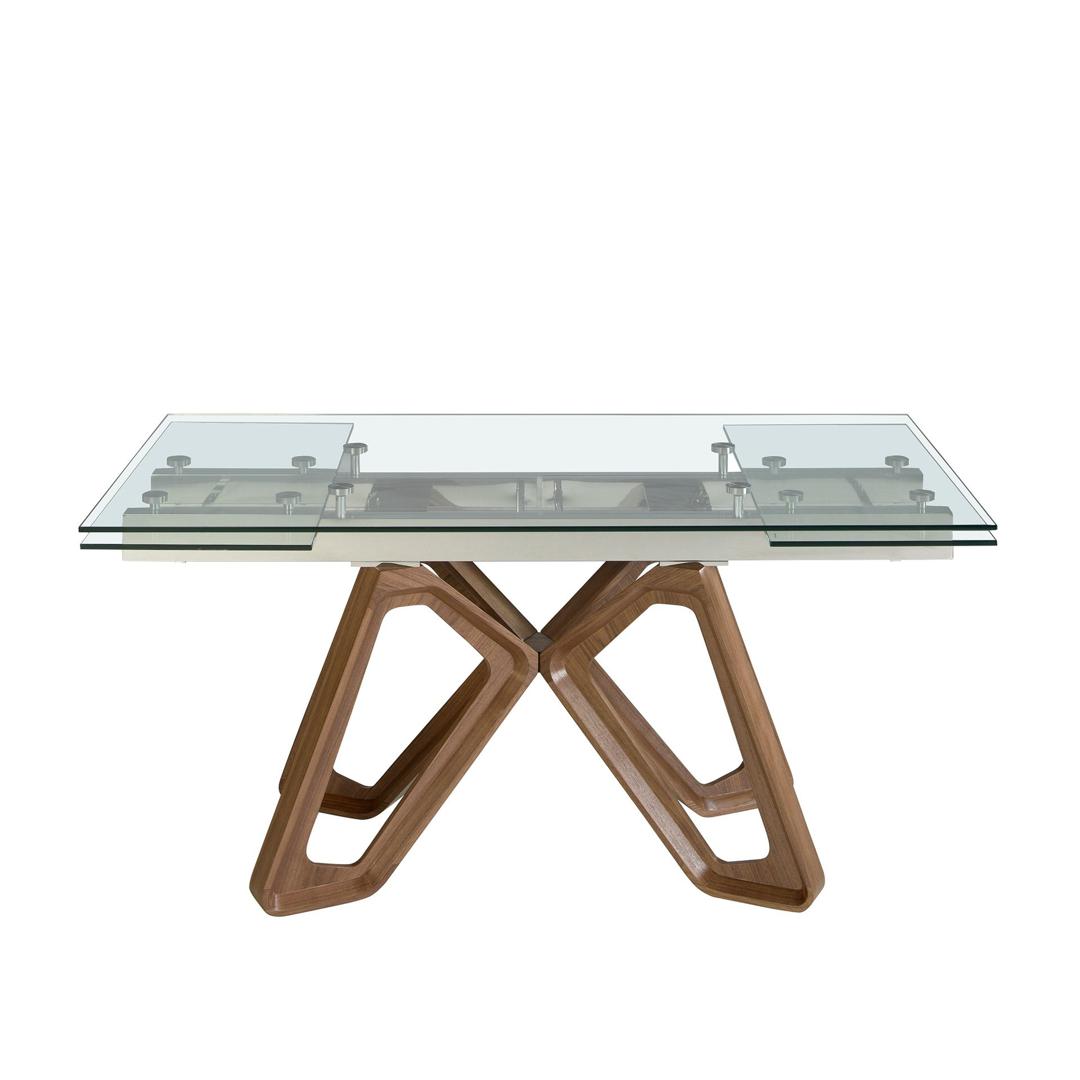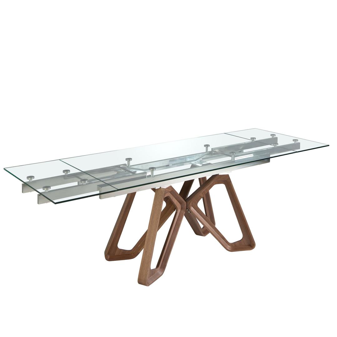 Прямоугольный раздвижной обеденный стол современного дизайна со столешницей из закаленного стекла. Деревянные ножки, покрытые шпоном натурального ореха, а также адаптируемость делают его полностью функциональным и универсальным предметом мебели для повседневного использования.