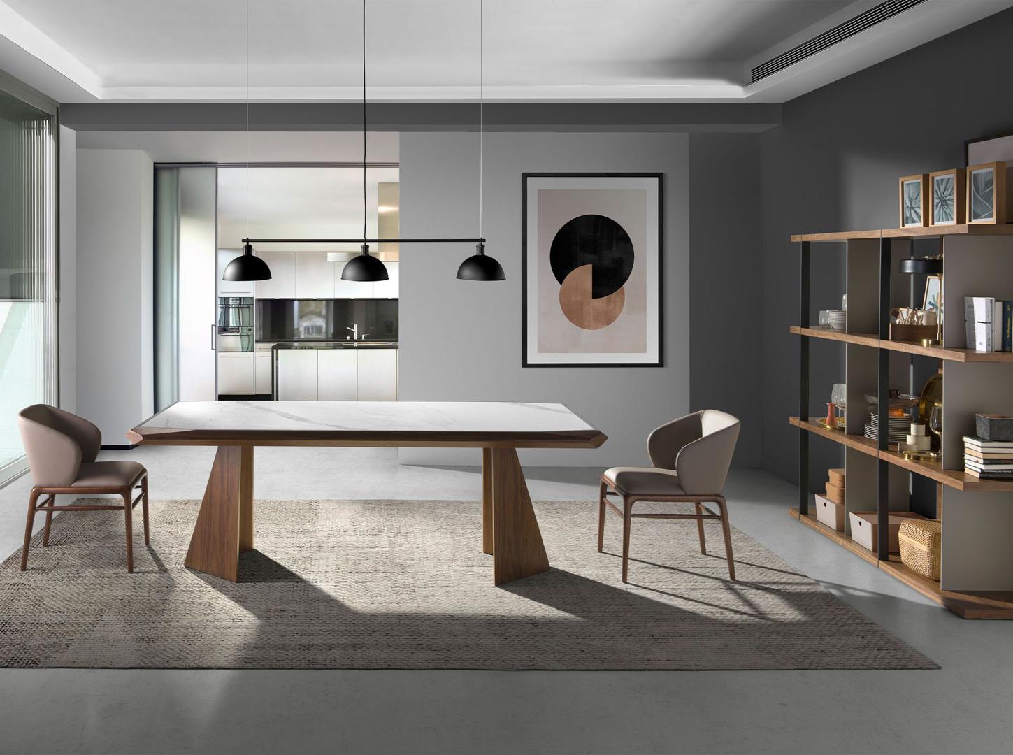 Прямоугольный обеденный стол современного дизайна из фарфорового мрамора calacatta толщиной 6 мм с матовой поверхностью и структурой из натурального шпона орехового дерева толщиной 0,5 мм. Благодаря своему геометрическому дизайну с инкрустированной столешницей из керамогранита и оригинальному дизайну ножек этот стол станет главным героем вашей гостиной.