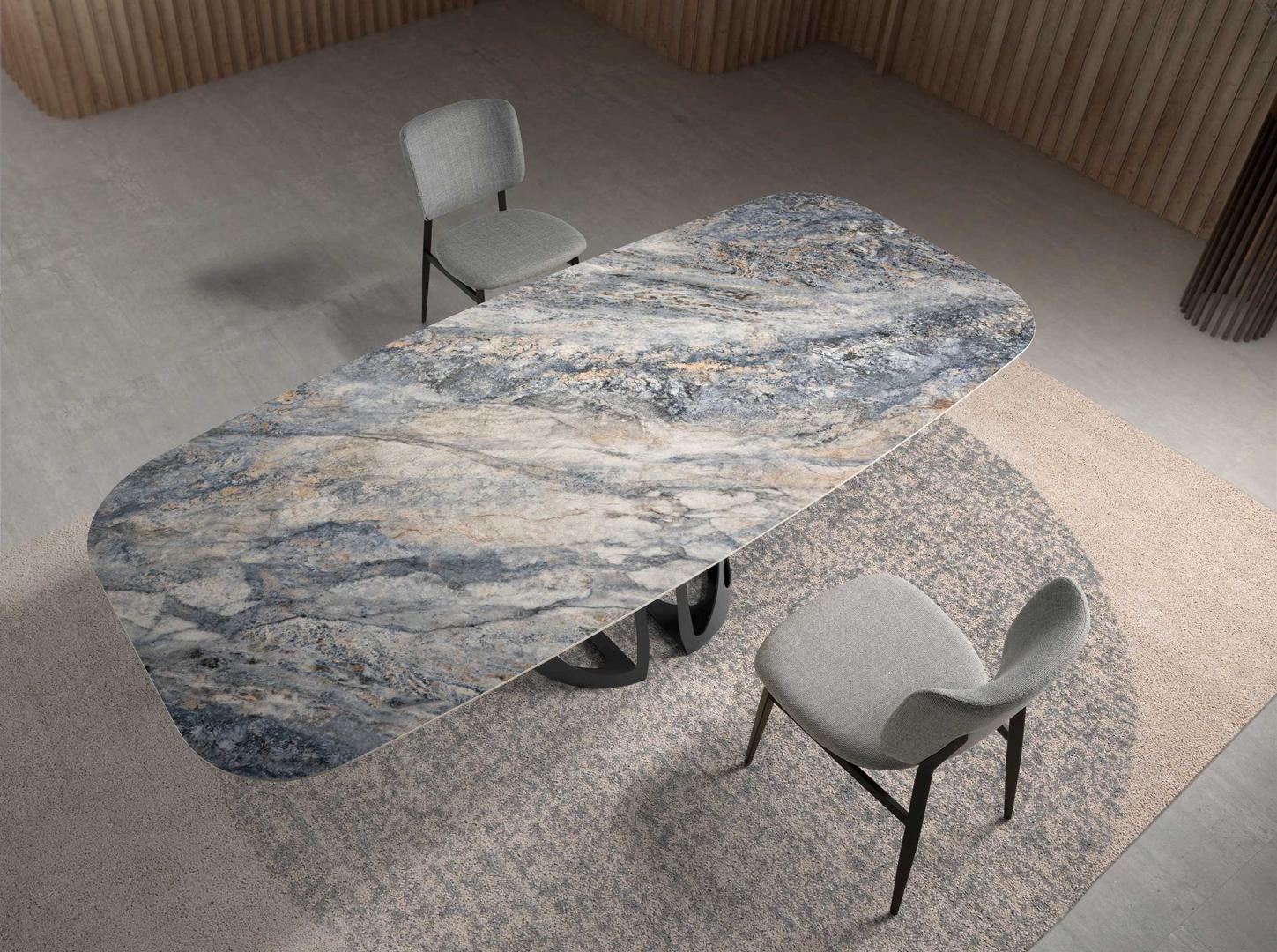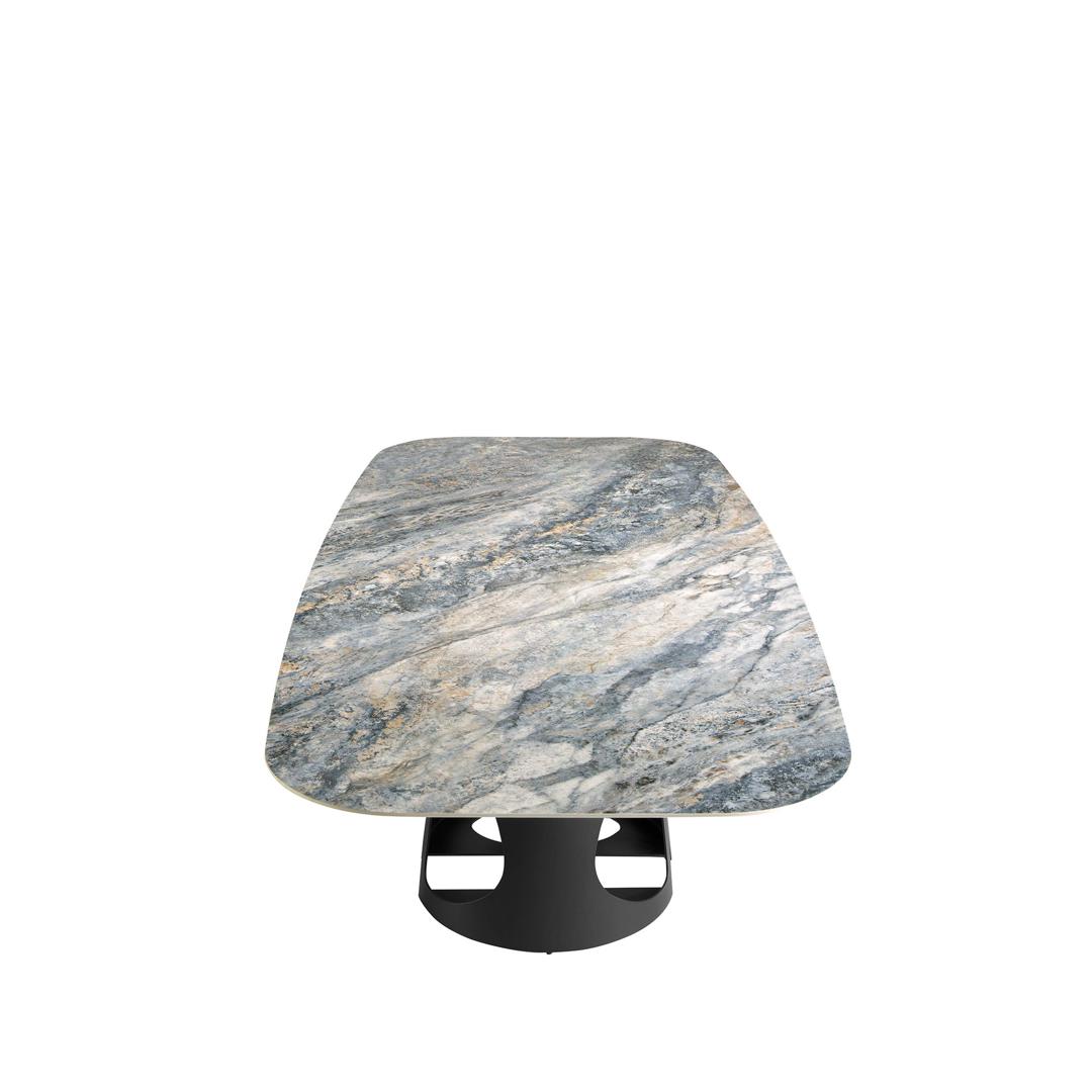 Современный дизайн овальный обеденный стол с фиксированной столешницей из синего фарфорового мрамора с серыми и коричневыми прожилками в глянцевой отделке. Его оригинальные черные ножки из нержавеющей стали, окрашенные в эпоксидную смолу, являются ключевыми элементами его дизайна.