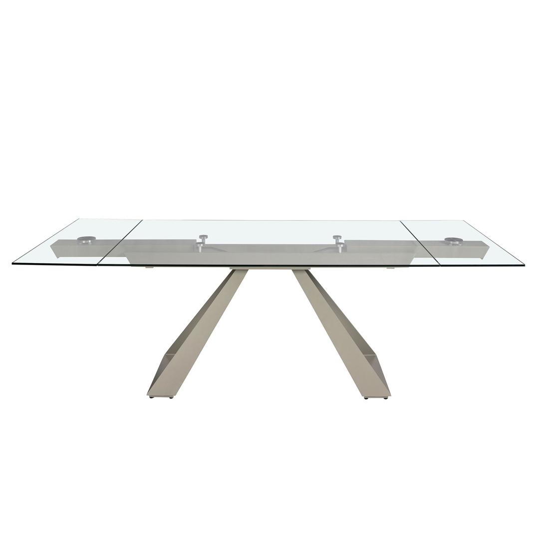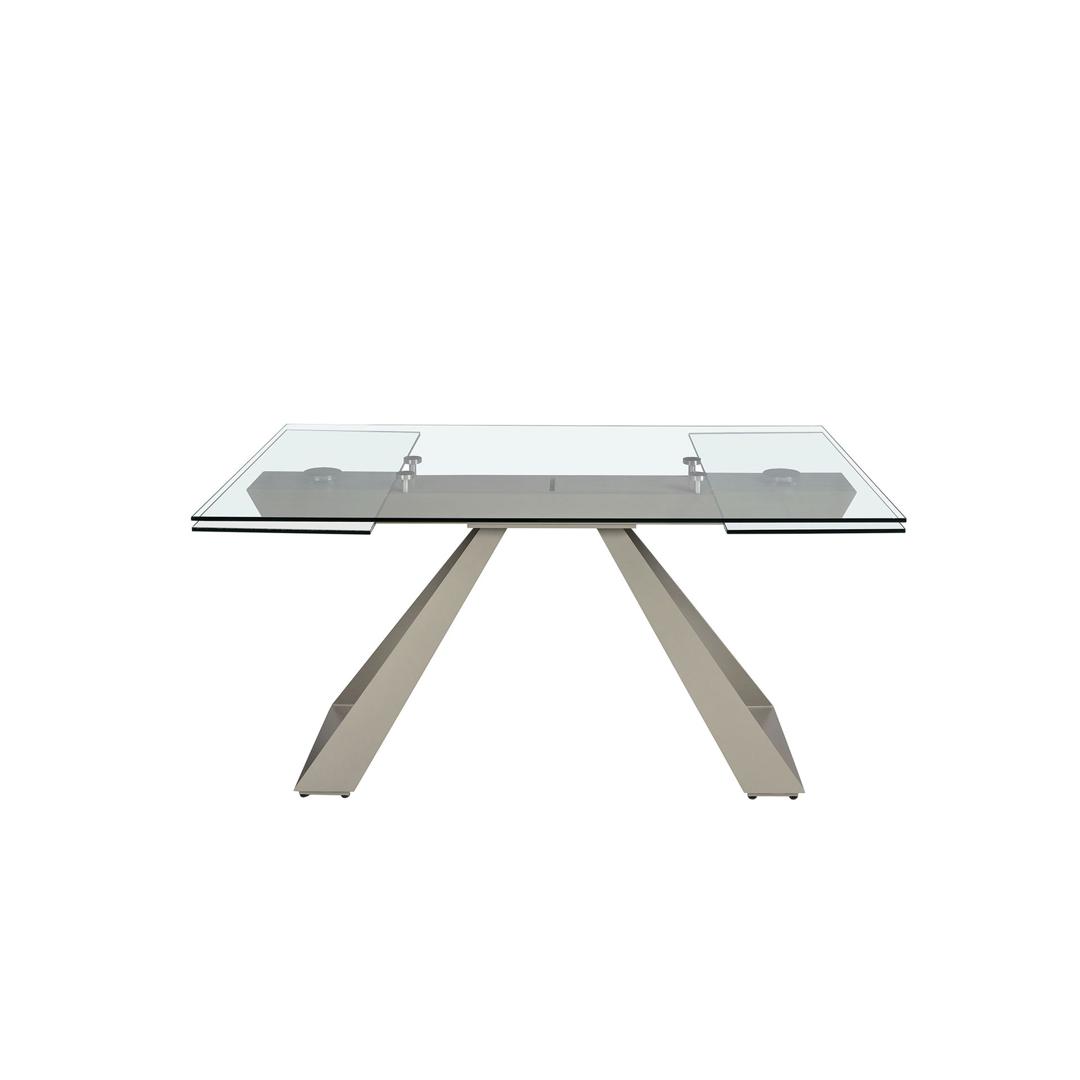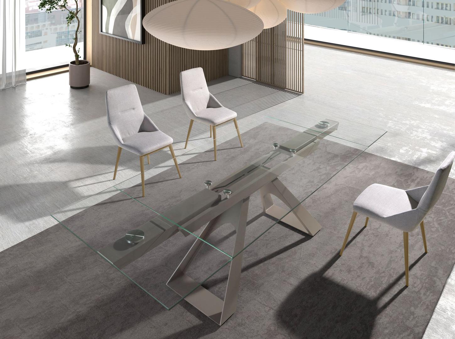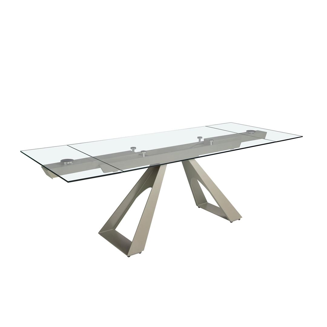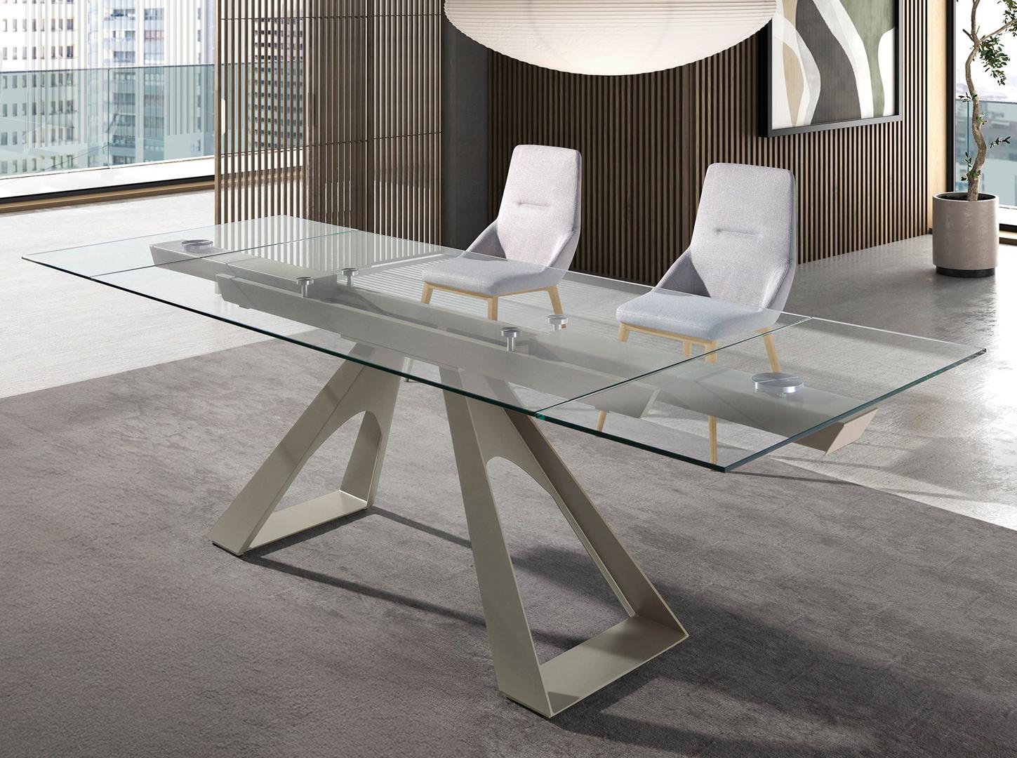 Прямоугольный раздвижной обеденный стол современного дизайна со столешницей из закаленного стекла. Ножки из нержавеющей стали, окрашенные в цвет шампанского, а также адаптируемость делают его абсолютно функциональным и универсальным предметом мебели для повседневного использования.