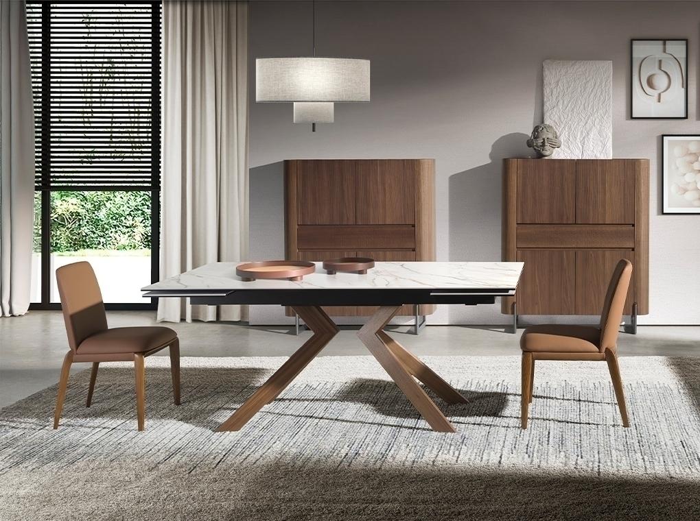 Прямоугольный раздвижной обеденный стол современного дизайна со столешницей из белого фарфора и мрамора с серыми и коричневыми прожилками в матовой отделке. Деревянные ножки, покрытые шпоном натурального ореха, а также адаптируемость делают его полностью функциональным и универсальным предметом мебели для повседневного использования.