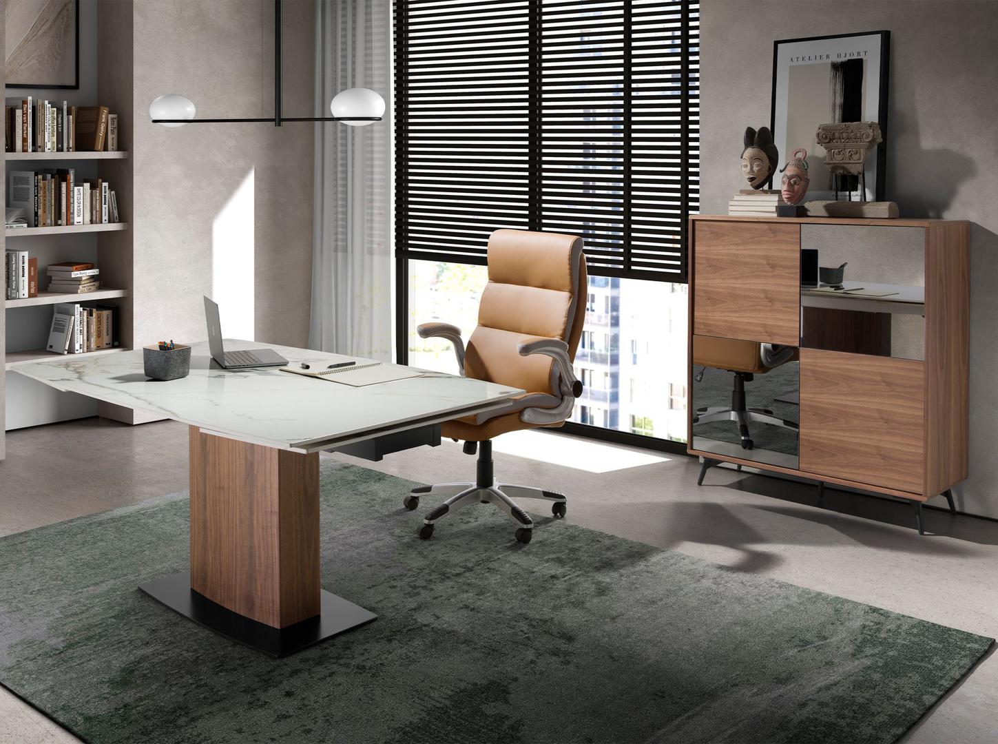 Раздвижной обеденный стол 1133/DT966 от фабрики Angel Cerda – керамика и ореховый шпон в современном дизайне. Раздвижной обеденный стол 1133/DT966 объединил в себе функциональность, прекрасный вид и практичность. Керамика в качестве столешницы выглядит эффектно и идеально подходит как материал для верха. Массивная деревянная стойка обеспечивает удобство и имеет уникальный вид. А для непоколебимой устойчивости производитель предусмотрел широкое стальное основание. И большой бонус – раздвижная конструкция. Пользоваться таким столом будет одно удовольствие! Стол прямоугольной формы, имеет сборную конструкцию. Столешница изготовлена из керамогранита бело-серого цвета. Сверху нанесен глянцевый слой защиты от мелких порезов, сколов. Стойка изготовлена из дерева и покрыта шпоном натурального ореха. Тон и рисунок древесины на каждом изделии уникальны. Для устойчивости к стойке прикручено металлическое основание, окрашенное в черный цвет глянцевой краской. Чтобы увеличить площадь столешницы, необходимо из-под центральной плиты с одной или обеих сторон (по необходимости) выдвинуть дополнительные секции. Они плотно удерживаются на металлической опоре снизу, обеспечивая равномерное распределение нагрузки. Размеры стола: ширина – 160/200/240 см, глубина – 100 см, высота – 76 см. Вес изделия – 136 кг. Потребуется самостоятельная сборка. Инструкция и крепеж включены в комплектацию. Стол предназначен только для эксплуатации в помещении.