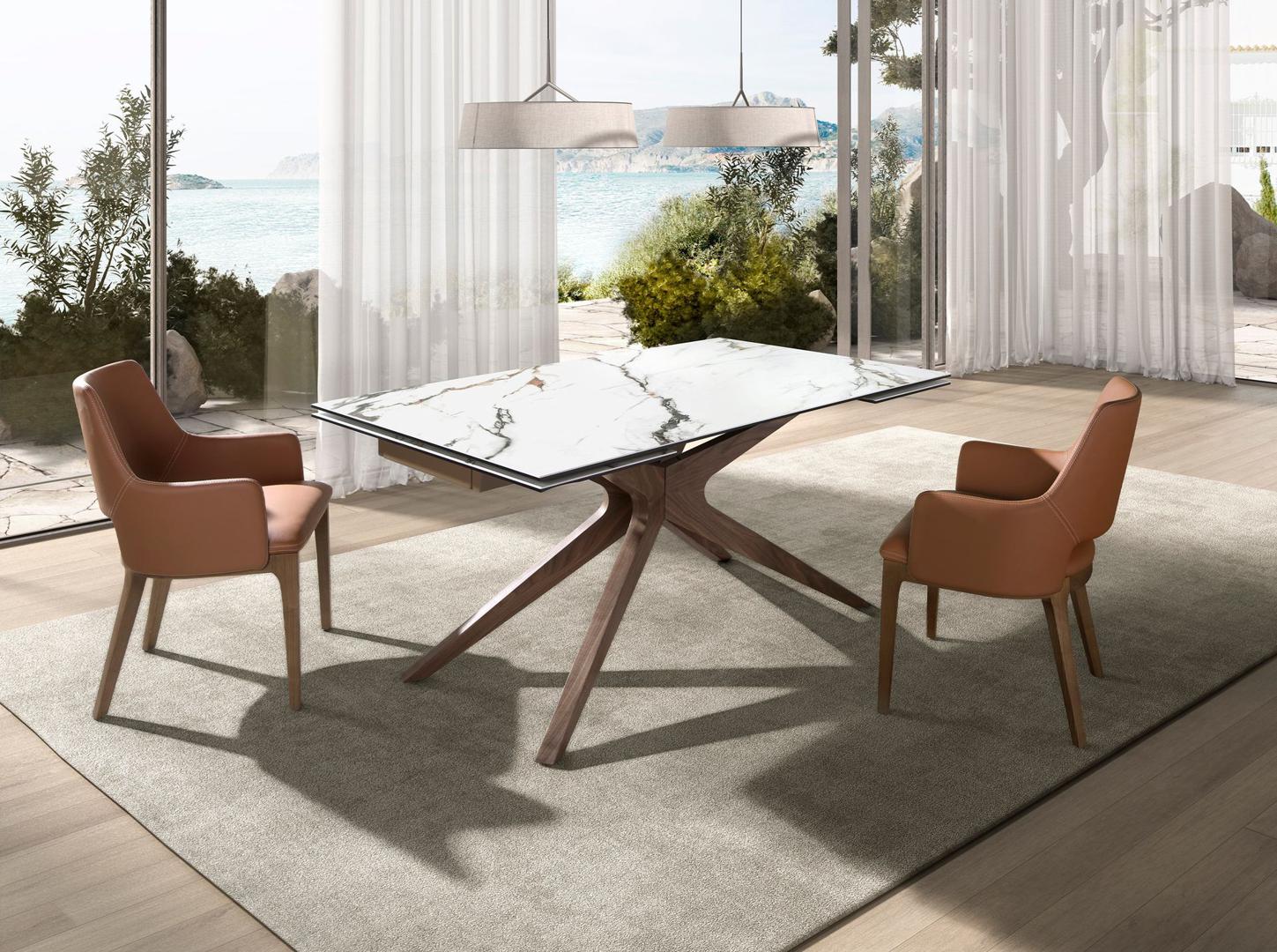 Прямоугольный раздвижной обеденный стол с современным дизайном , с белой фарфоровой мраморной столешницей с серыми прожилками и деталями ржавчины в матовой отделке . Его ножки из натурального орехового шпона и адаптивность делают его полностью функциональным и универсальным предметом мебели для повседневного использования.