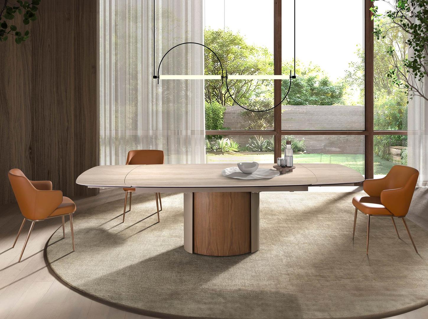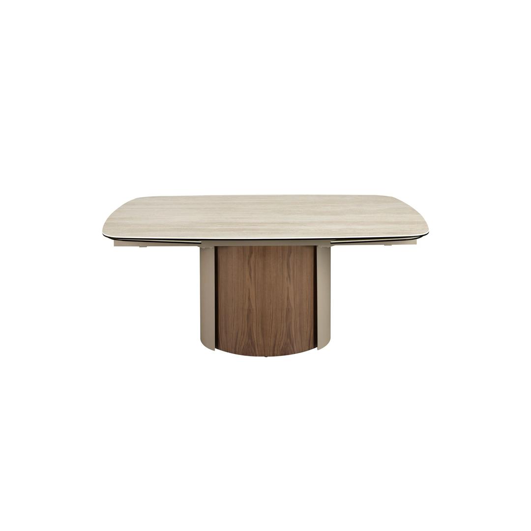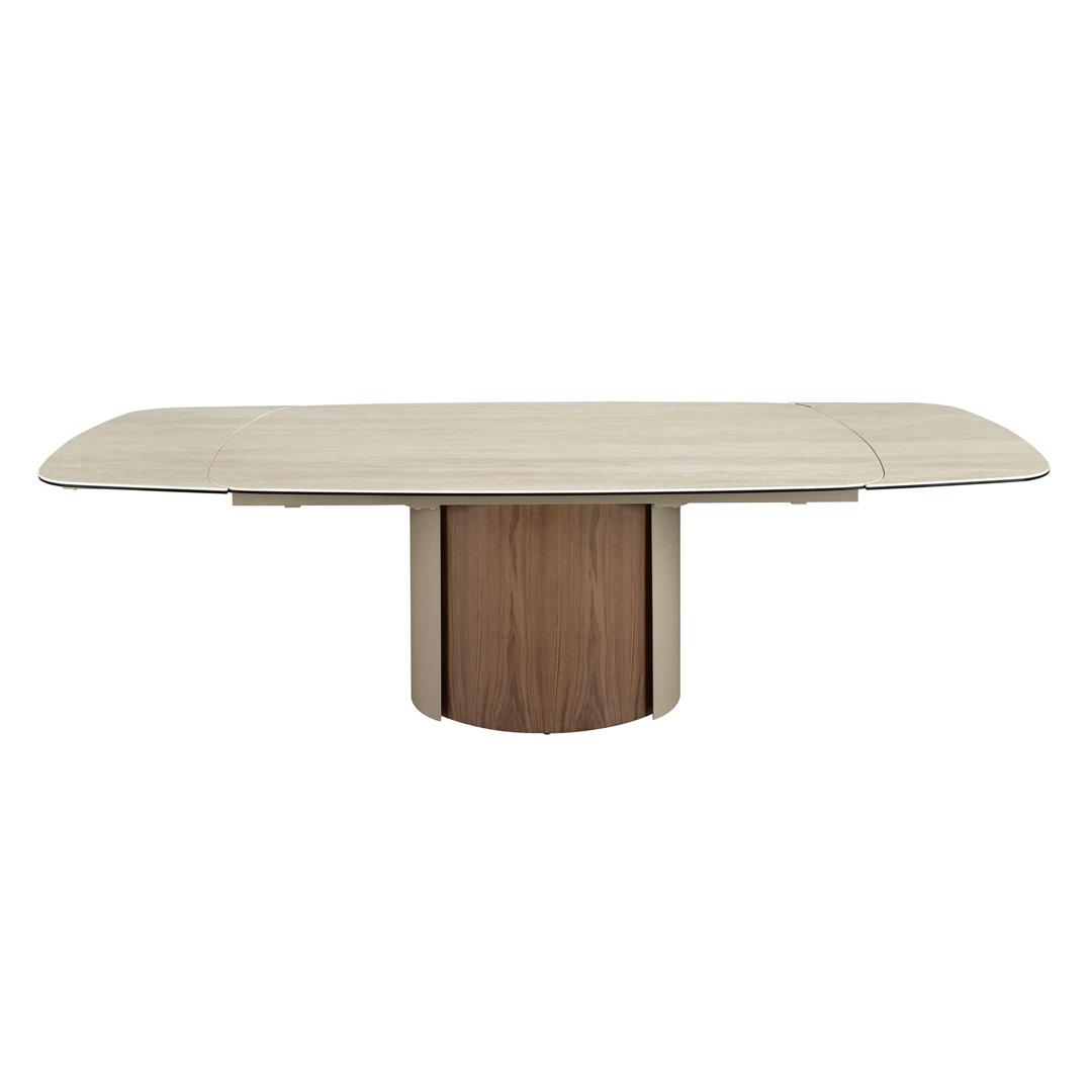 Прямоугольный раздвижной обеденный стол современного дизайна со столешницей из керамогранита песочного цвета с матовой отделкой. Ножки из нержавеющей стали, окрашенные в песочный цвет с металлическим эффектом, и натуральный шпон ореха толщиной 0,5 мм, а также возможность адаптации делают его полностью функциональным и универсальным предметом мебели для повседневного использования.