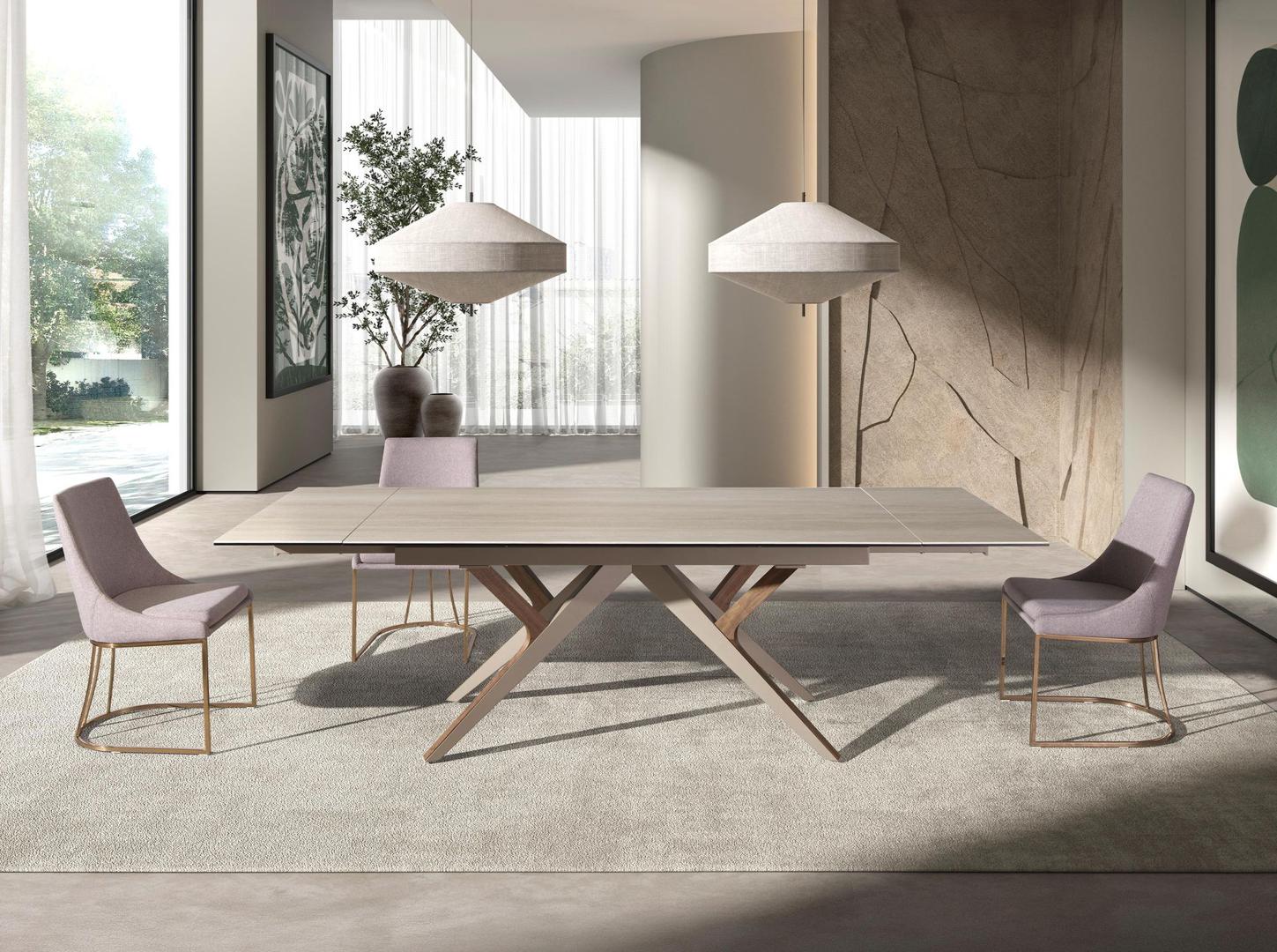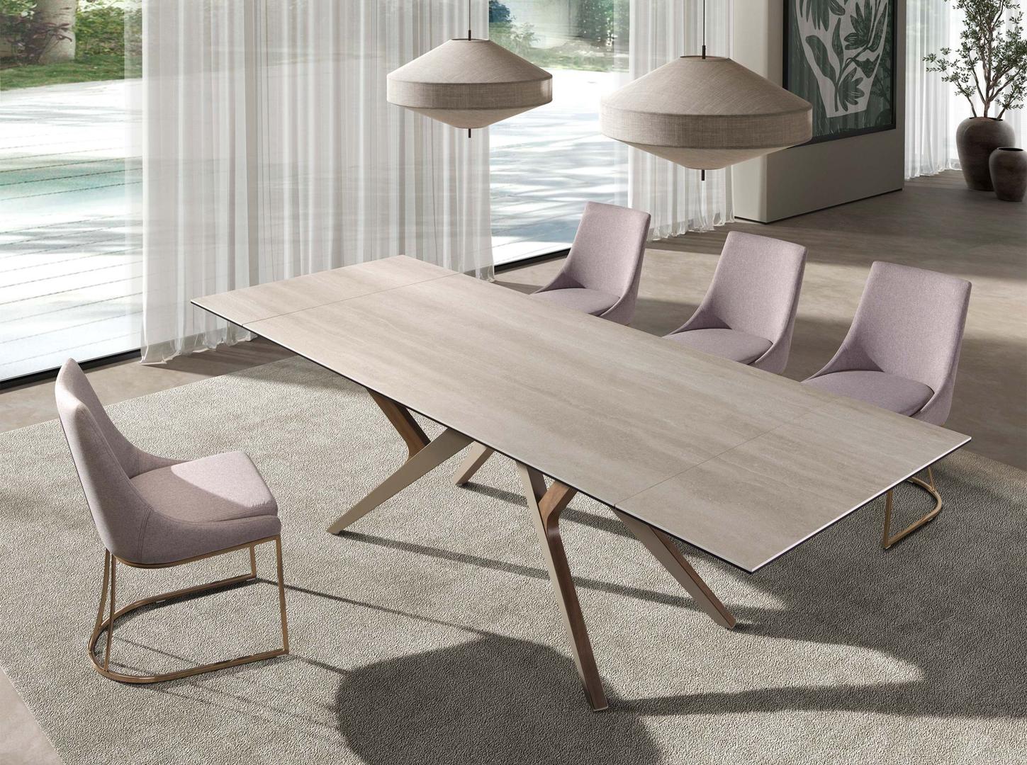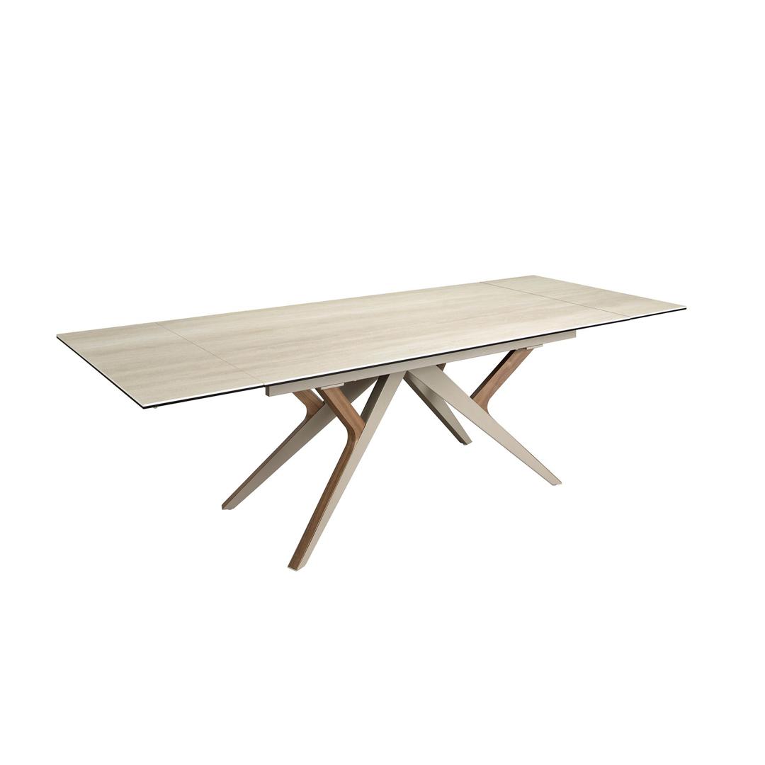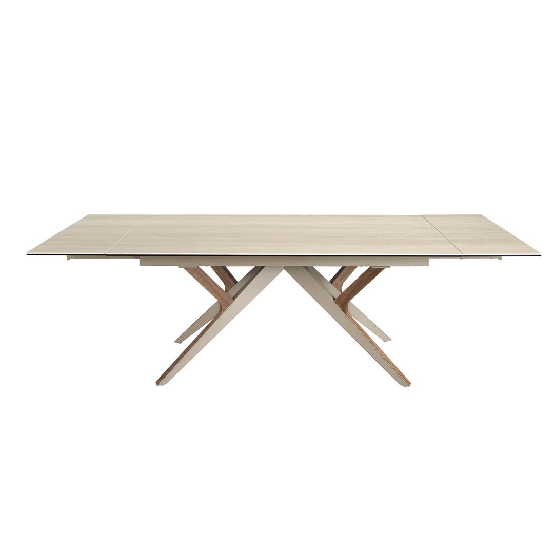 Прямоугольный раздвижной обеденный стол современного дизайна со столешницей из керамогранита песочного цвета с матовой отделкой. Ножки из нержавеющей стали, окрашенные в песочный цвет с металлическим эффектом, и натуральный шпон ореха толщиной 0,5 мм, а также возможность адаптации делают его полностью функциональным и универсальным предметом мебели для повседневного использования.