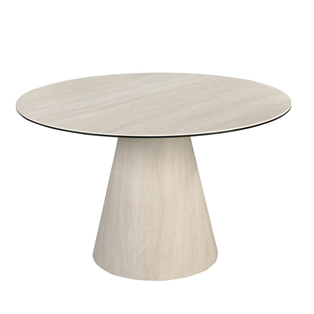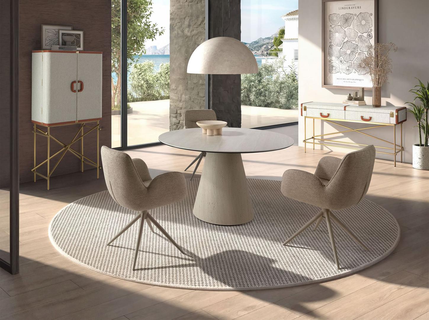 Современный круглый обеденный стол с фиксированной столешницей из керамогранита песочного цвета с матовой поверхностью. Ключевыми элементами дизайна являются оригинальные деревянные ножки, покрытые гибким листом керамогранита песочного цвета.