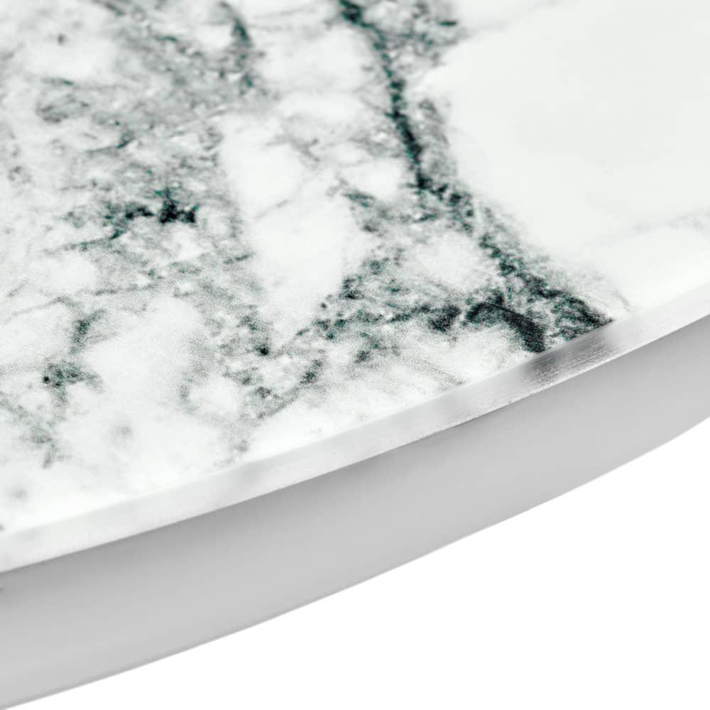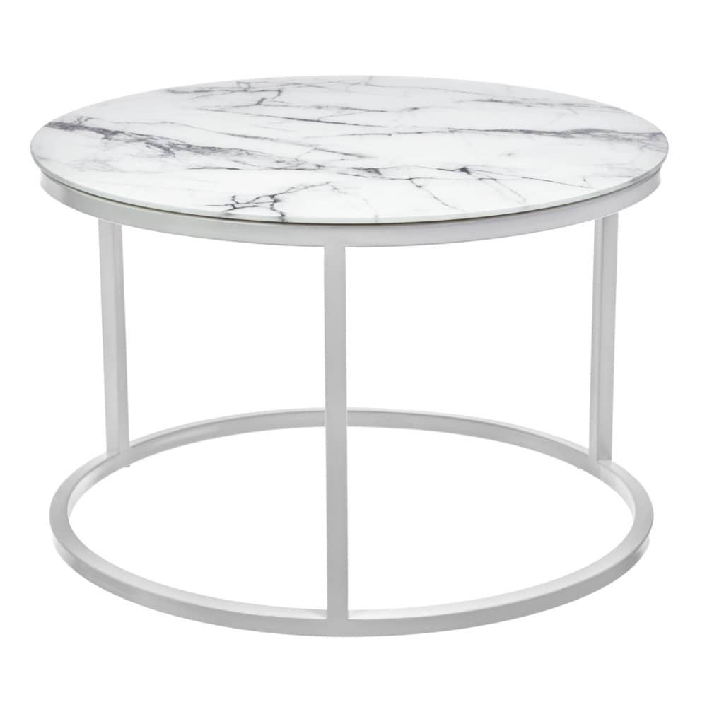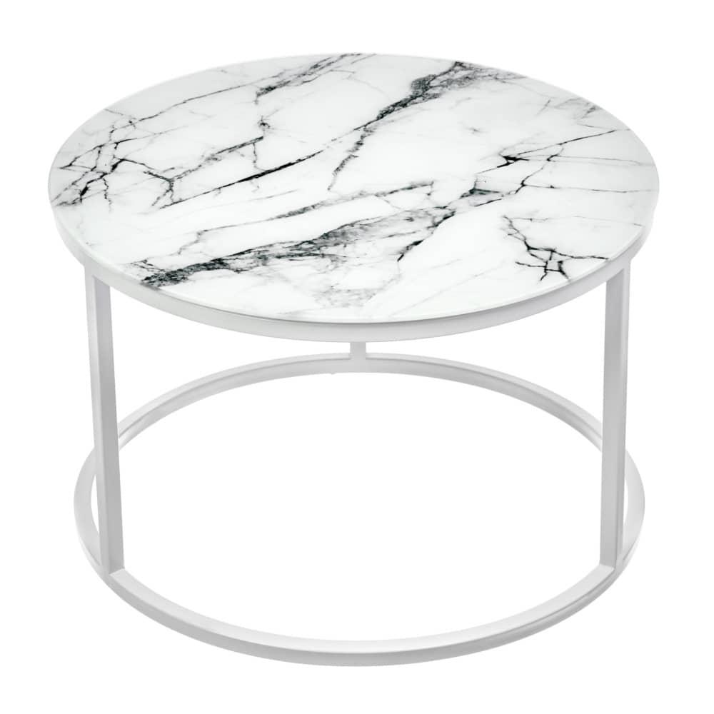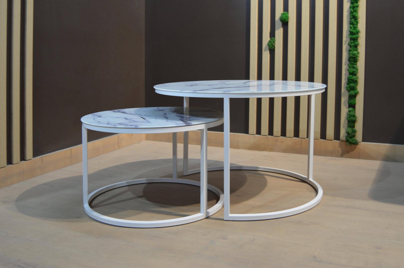 Элегантная пара кофейных столиков Tango станет изящным дополнением любой гостинной или даже спальни. Рисунок на столешнице, имитирующий натуральный мрамор, завораживает и притягивает взгляд. Столики можно расположить парой или расставить по отдельности. Белые ножки позволят вписать этот набор в любой интерьер. Размер большого столика: диам.60см, высота 41см. Размер маленького столика: диам.47,5см, высота 31см.