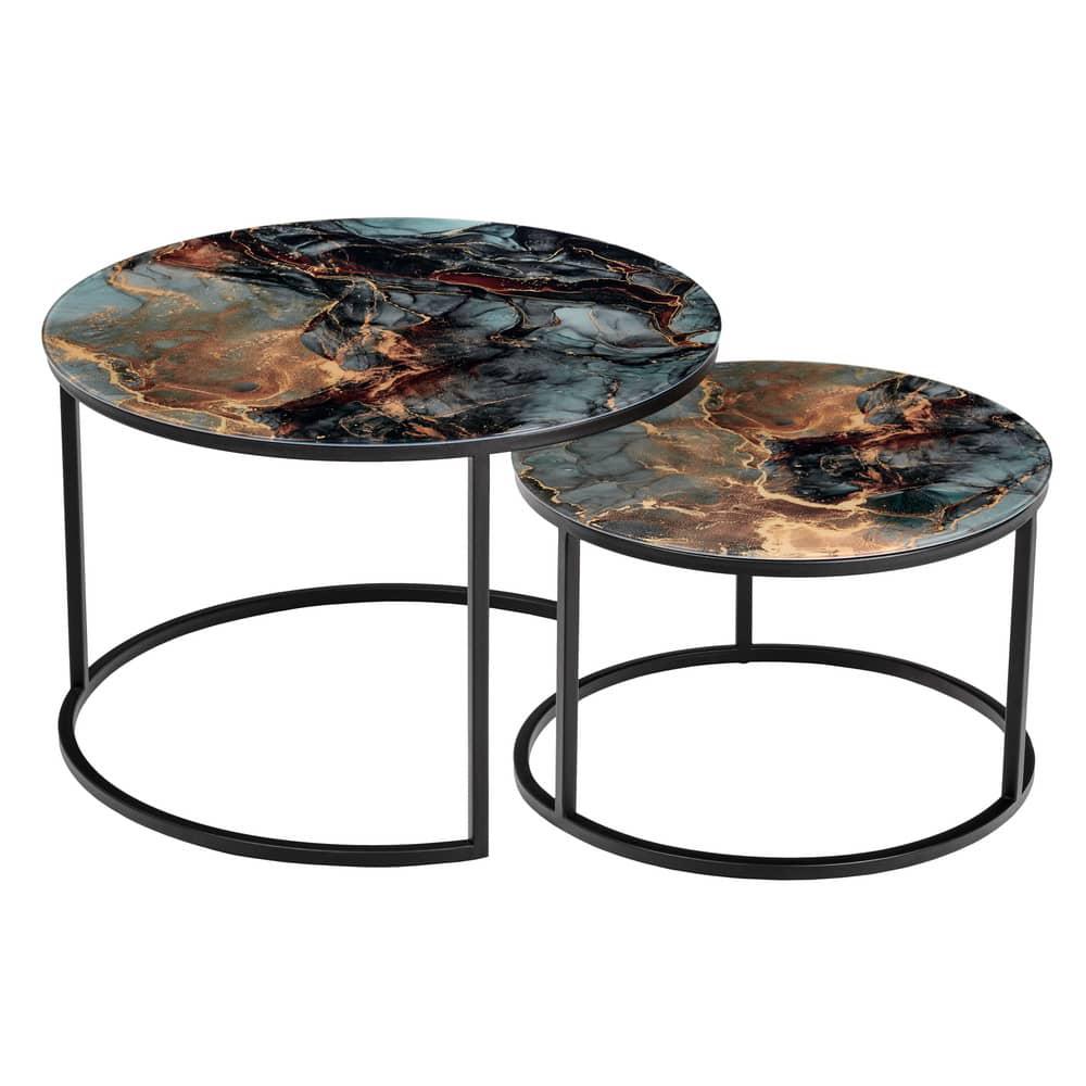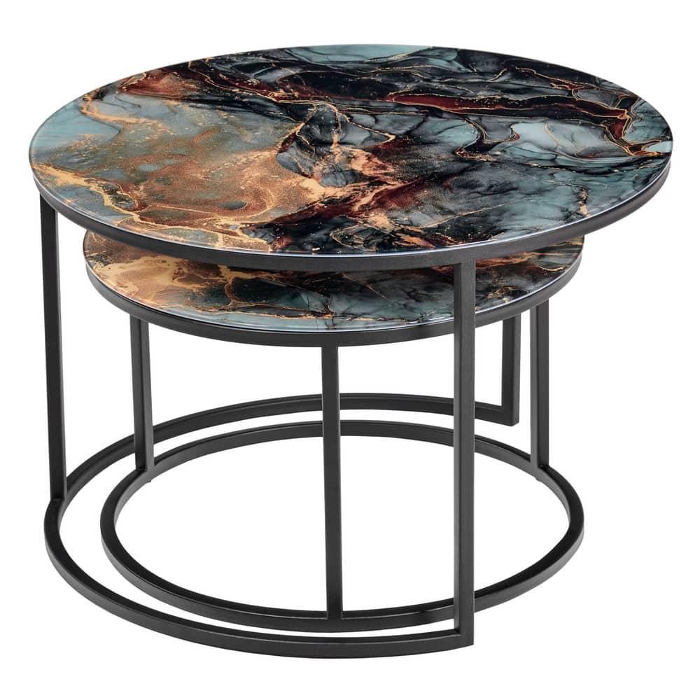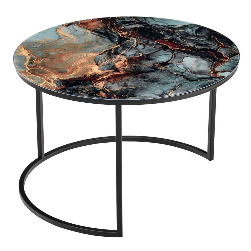 Элегантная пара кофейных столиков Tango станет изящным дополнением любой гостинной или даже спальни. Рисунок на столешнице, выполенной из закалённого стекла, завораживает и притягивает взгляд. Столики можно расположить парой или расставить по отдельности. Чёрные ножки позволят вписать этот набор в любой интерьер. Размер большого столика: диам.60х41см. Размер маленького столика: диам.47,5х31см