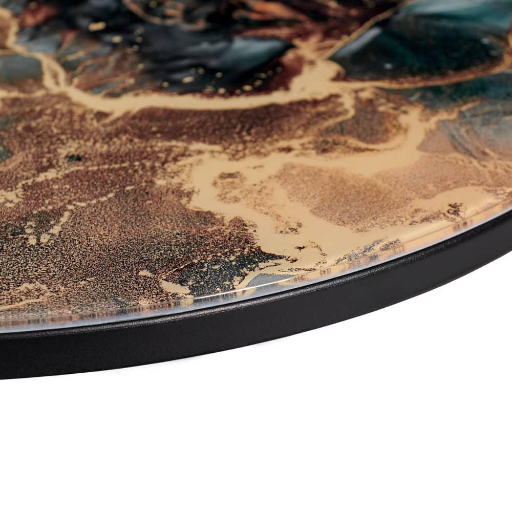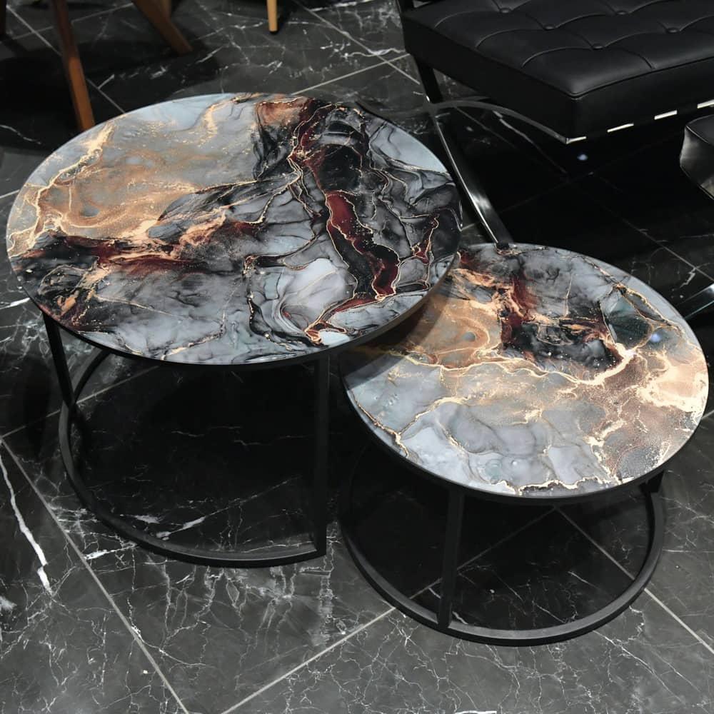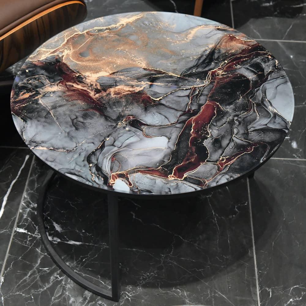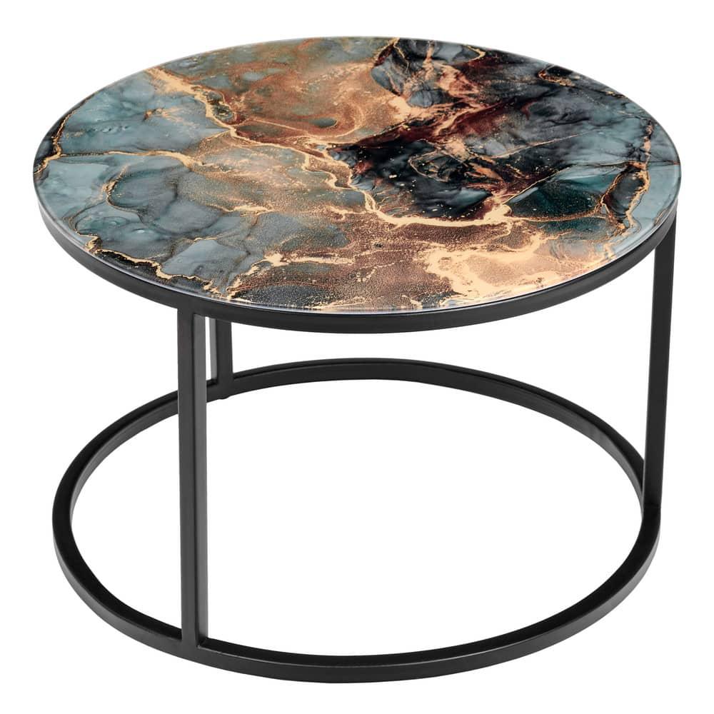 Элегантная пара кофейных столиков Tango станет изящным дополнением любой гостинной или даже спальни. Рисунок на столешнице, выполенной из закалённого стекла, завораживает и притягивает взгляд. Столики можно расположить парой или расставить по отдельности. Чёрные ножки позволят вписать этот набор в любой интерьер. Размер большого столика: диам.60х41см. Размер маленького столика: диам.47,5х31см
