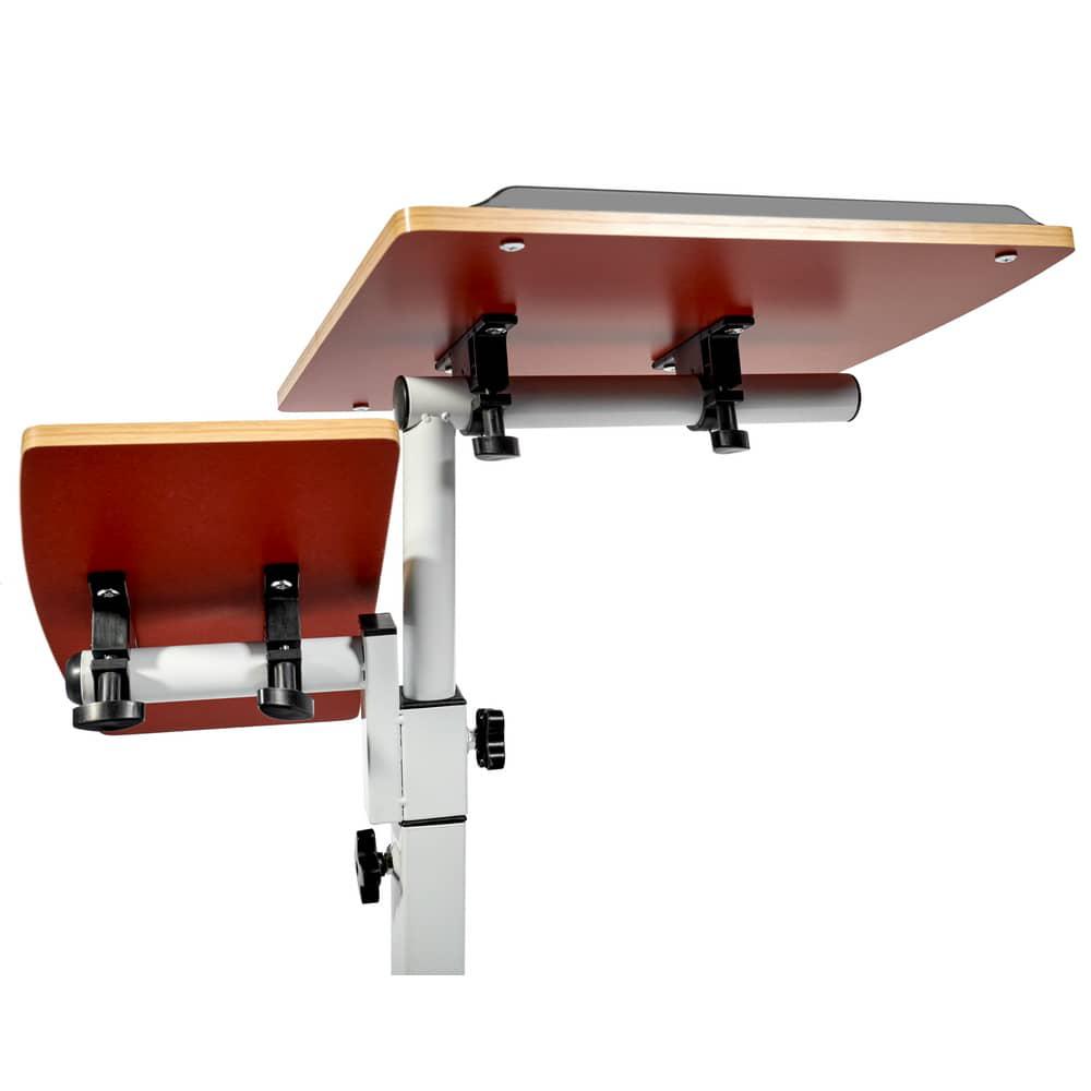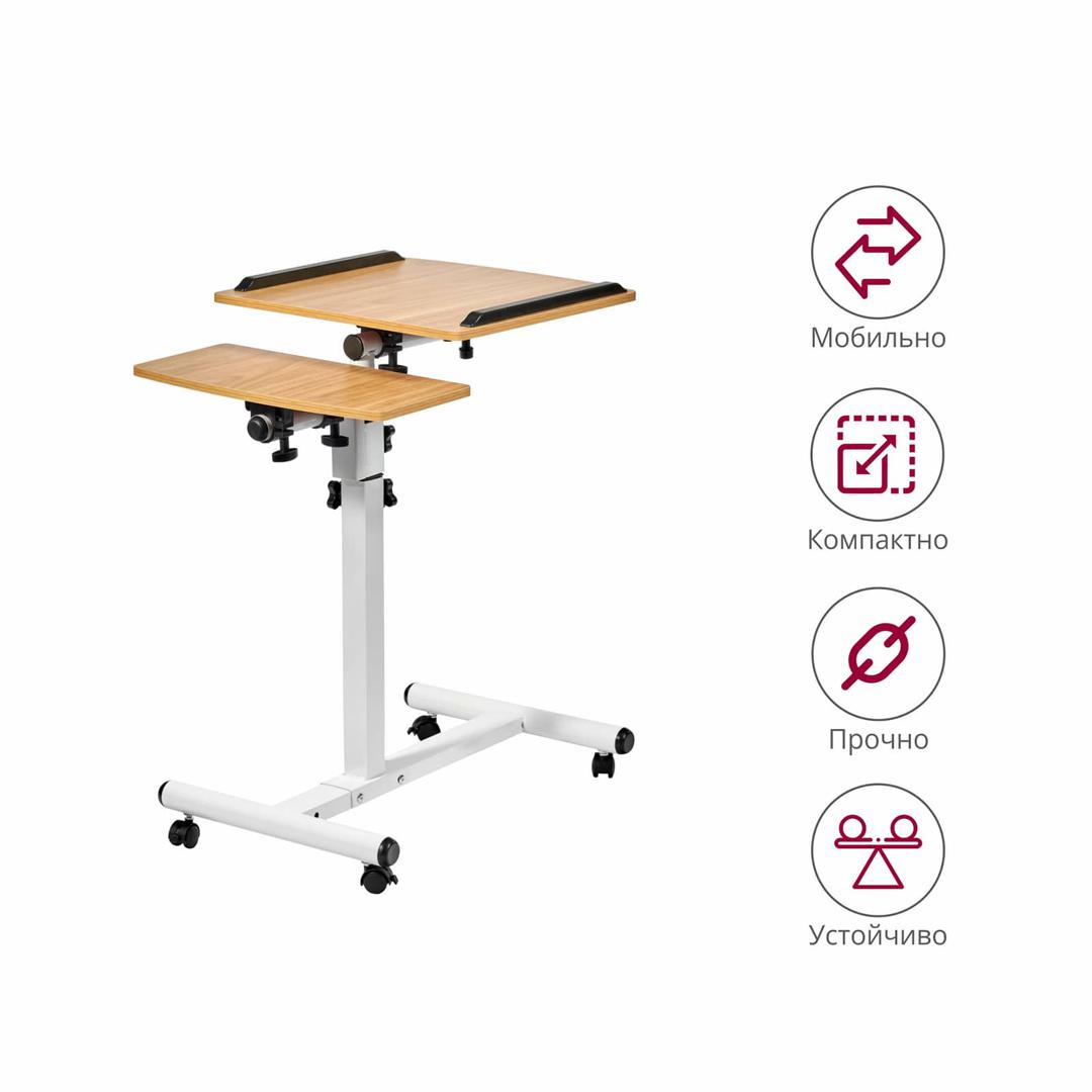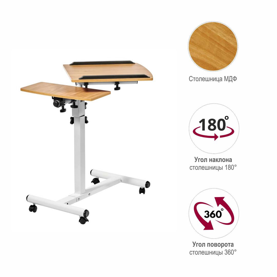 Столик оборудован поворотной столешницей из МДФ, состоящей из двух независимых частей, и металлическим основанием. Угол поворота столешницы составляет 180°, вплоть до вертикального положения. Высота подъема регулируется в диапазоне от 62 до 96 см. На столешнице имеются ограничители для ноутбука, планшета, предотвращающие падение гаджета.