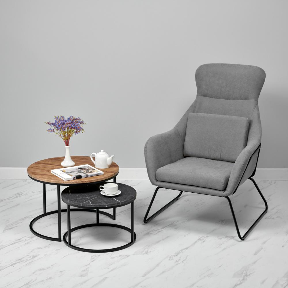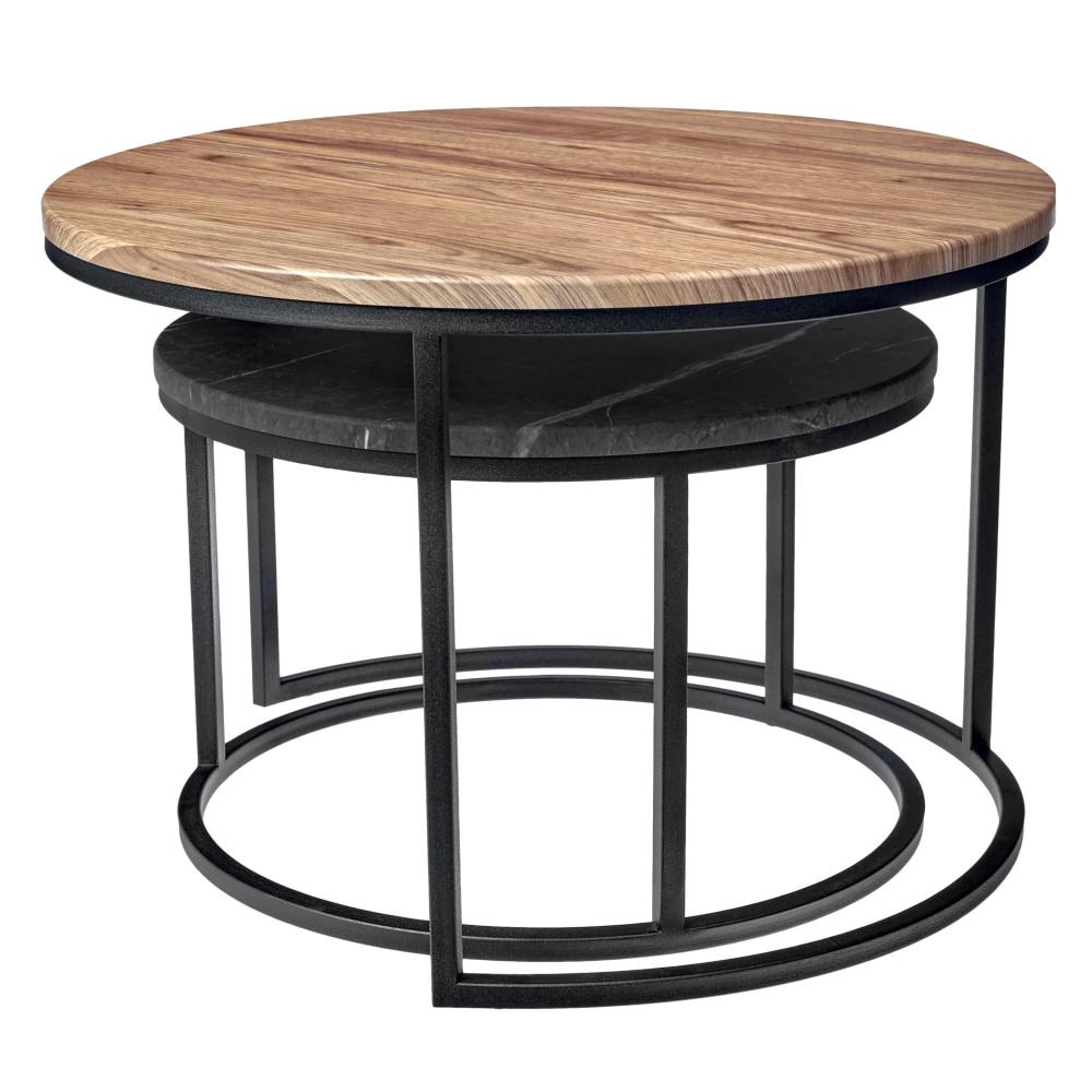 Элегантная пара кофейных столиков Tango станет изящным дополнением любой гостинной или даже спальни. Рисунок на столешнице, имитирующий натуральное дерево и мрамор, завораживает и притягивает взгляд. Столики можно расположить парой или расставить по отдельности. Чёрные ножки позволят вписать этот набор в любой интерьер. Размер большого столика: диам.60см, высота 42см. Размер маленького столика: диам.47,5см, высота 32см.