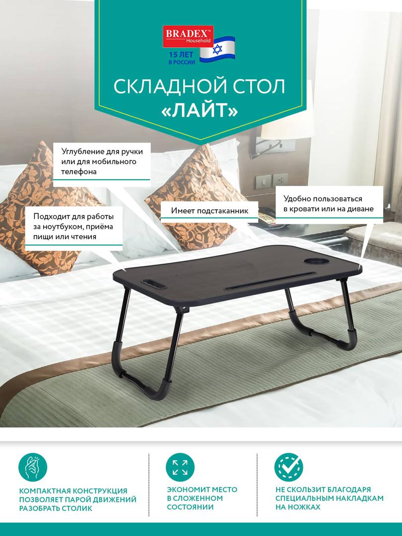 Складной стол Лайт — находка для тех, кто работает за ноутбуком с дивана и не хочет садиться за письменный стол. Компактная конструкция позволяет парой движений разобрать столик (достаточно лишь перевернуть его, откинуть ножки до конца и перевернуть обратно) и экономит место в сложенном состоянии. Стол имеет встроенный подстаканник и углубления, куда можно сложить ручки или смартфон. Столешница сделана из безопасного и экологически чистого материала, устойчива к влаге и царапинам. Антискользящие накладки на ножках стола предотвратят неожиданные падения конструкции. Работать из кровати или сервировать завтрак в постель, читать перед сном или обедать на природе — какую бы цель вы ни преследовали, складной стол Лайт реализует её!
