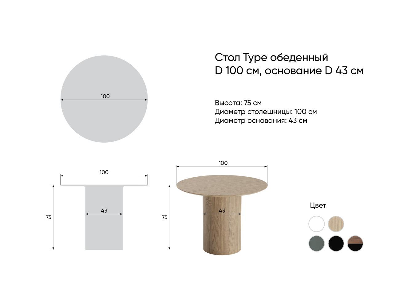 Высота: 75 см Диаметр столешницы: 100 см Диаметр основания: 43 см Вес: 64 кг Материал: массив березы, шпон дуба, мдф Покрытие: RAL 9003