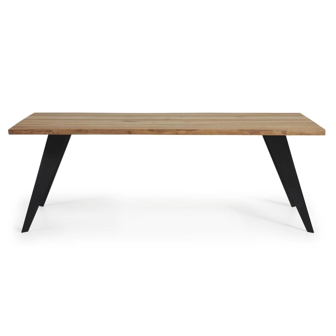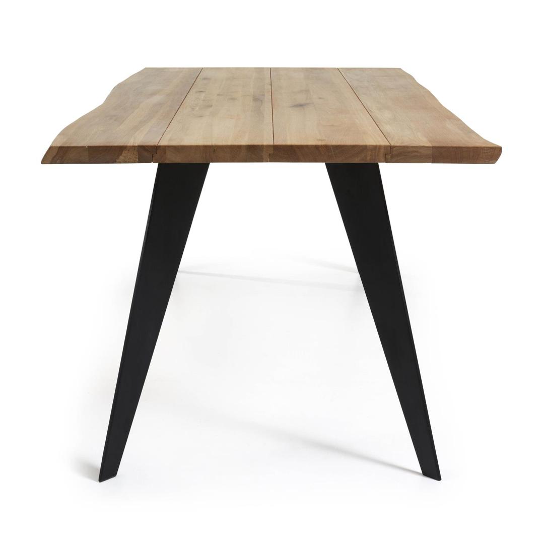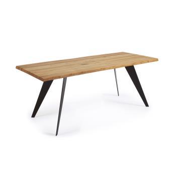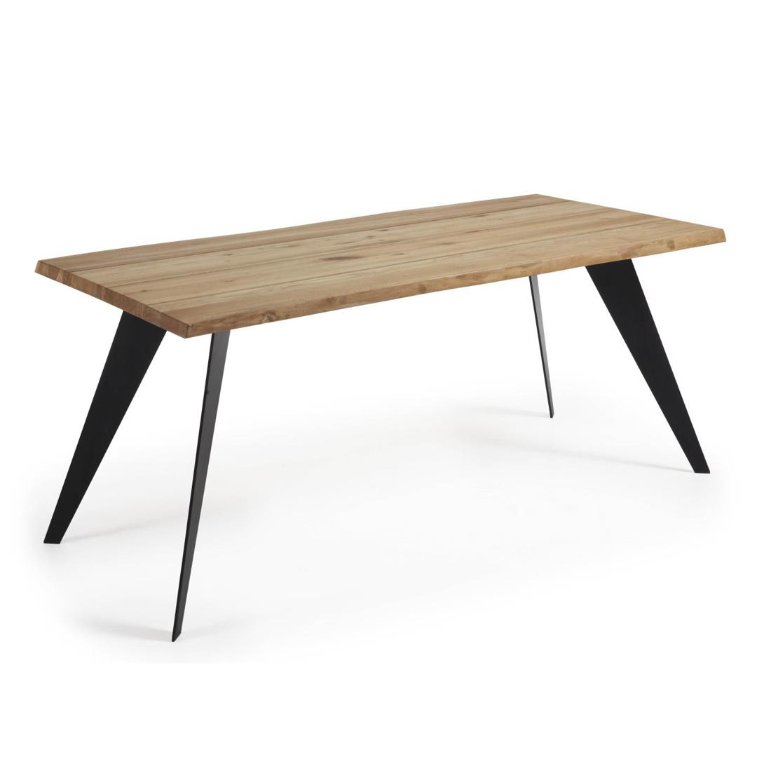 Стол Nack из дуба от фабрики La Forma – когда гармония дерева и металла создают яркий минимализм. Стол Nack – это модель, в которой тесно переплелись два стиля. Четкая геометрия металлических ножек – явный элемент минимализма, а деревянная столешница с натуральной фактурой – безусловный признак скандинавского стиля. Такая модель однозначно придаст городскому интерьеру оригинальность и добавит авторского стиля. Стол прямоугольной формы. Столешница сделана из массива дуба. Она имеет толщину 4 см, покрыта лаком для защиты от влаги и загрязнений при эксплуатации. Для акцента на натуральность древесной породы, боковые грани имеют неровные срезы, а поверхность в точности передает природную красоту дерева. В зависимости от выбранной модели, цвет столешницы может быть светло-бежевым (беленый дуб) или коричневым (античный дуб). Ножки сделаны из металла и покрыты черной порошковой краской. Они треугольной формы, с шириной грани у основания 19 см. Для защиты напольного покрытия от повреждений на каждой ножке есть наконечник. Размеры: длина – 180 см, ширина – 100 см, высота – 78 см. Вес стола составляет 87,025 кг. Потребуется сборка. Инструкция и крепеж включены в комплектацию.