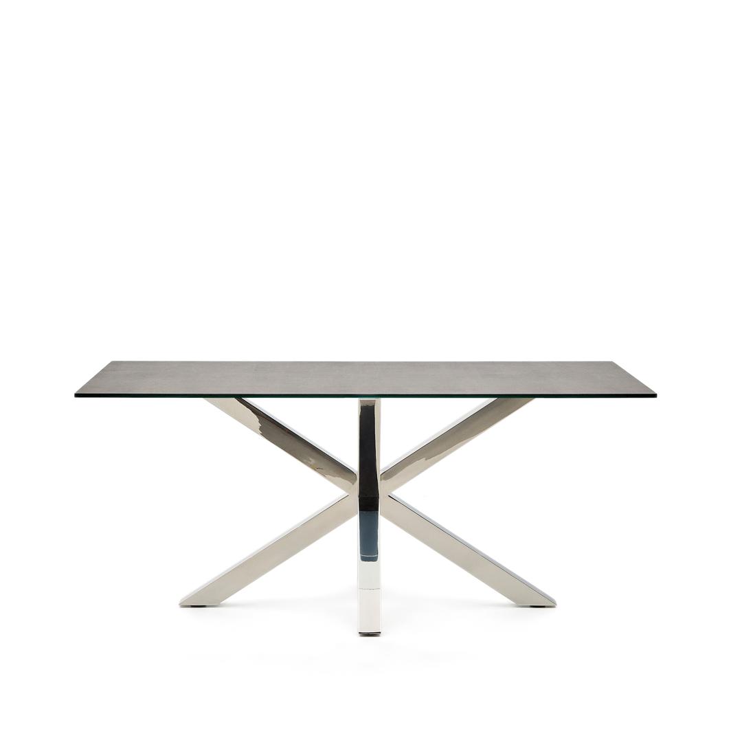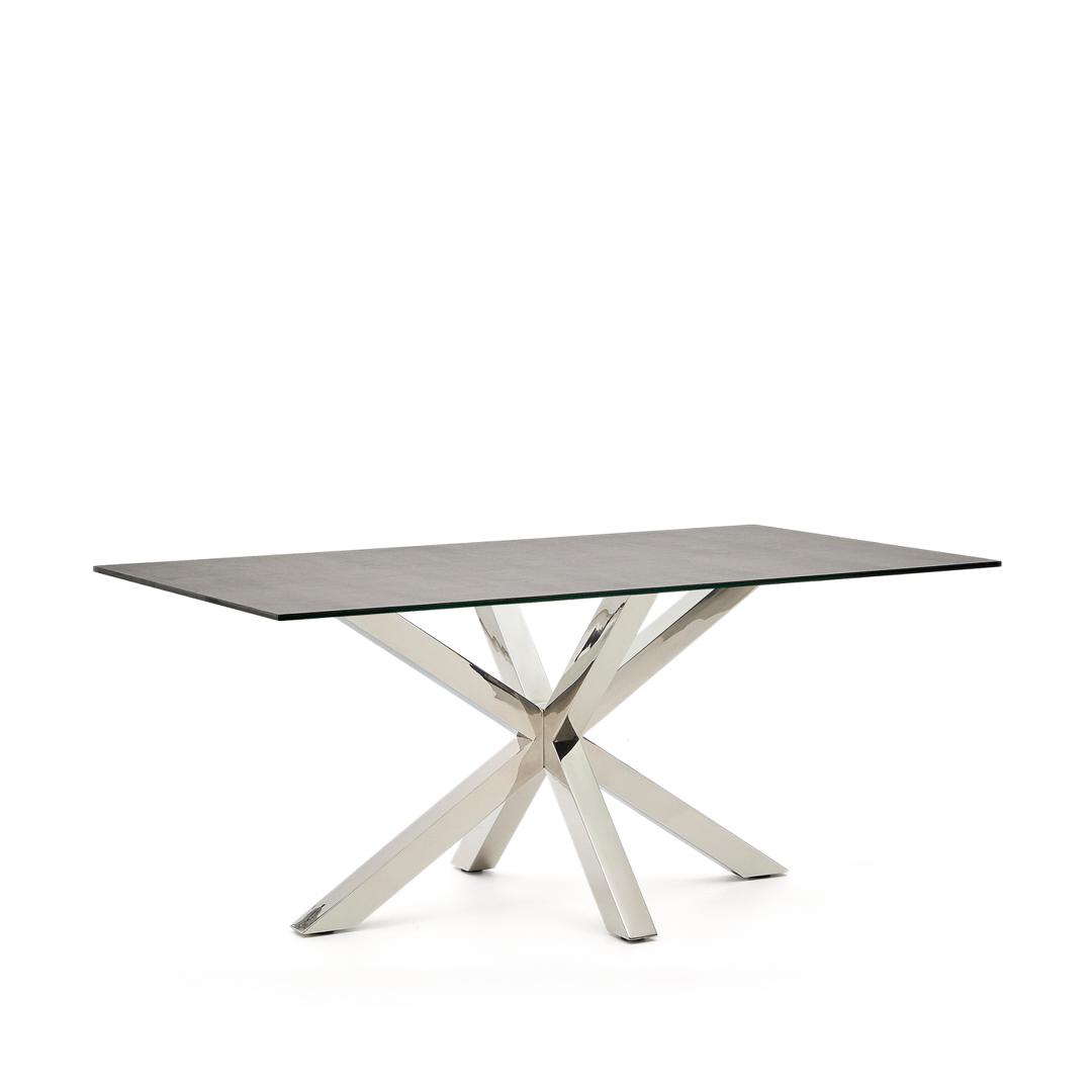 Обеденный стол со столешницей из высокотехнологичного фарфора со стеклянной опорой. Отделка «Железный мох». Ножки из нержавеющей стали.