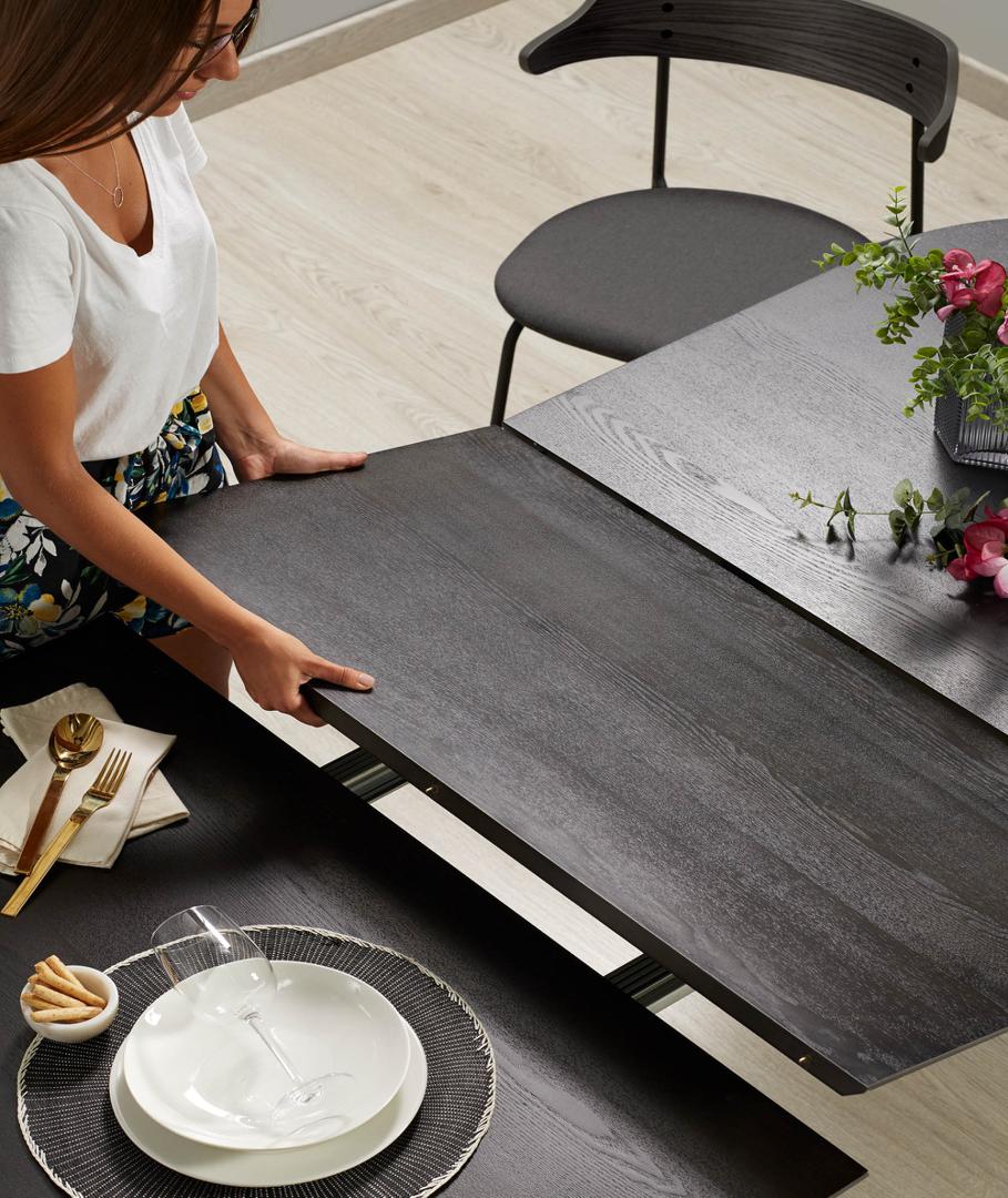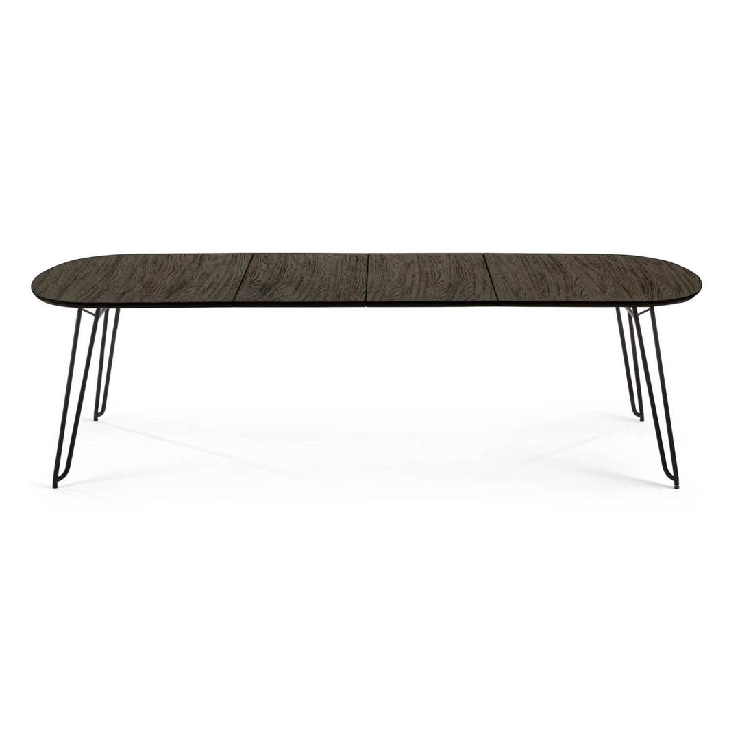 Стол раздвижной Norfort от фабрики La Forma – потрясающий фьюжн для квартиры «со вкусом». Стол выглядит очаровательно и стильно. Его изящная конструкция визуально облегчает внешний вид. Поэтому он кажется совершенно негабаритным, даже если раздвинуть столешницу. Да, дизайнерам удалось соединить несовместимое – утонченность и большую площадь. Стол отлично подойдет для гостиной в городской квартире, оформленной в современном стиле. Стол овальной формы. Столешница сделана из МДФ натурального дерева. Для защиты поверхности во время эксплуатации, на нее нанесено специальное покрытие. Цвет столешницы у базовой модели – венге. Опора имеет сварную конструкцию, сделана из металла, покрытого черной эпоксидной краской. Она состоит из четырех двойных ножек, рамы, поддерживающей столешницу по всему периметру, и поперечных перекладин, обеспечивающих прочность при нагрузках. Чтобы удлинить стол, нужно раздвинуть края столешницы и извлечь дополнительные панели. Далее их следует уложить на металлические направляющие. В зависимости от выбранной модели, максимальная длина стола составляет 320 см. Размеры: длина – 140-220 или 170-320 см, ширина – 90 или 100 см, высота – 75 см. Для самостоятельной сборки в комплектацию включены инструкция и крепеж. В коллекции Norfort также представлены круглый стол, тумба под ТВ, буфет. Во избежание повреждения поверхности столешницы рекомендуется использовать скатерти или салфетки.