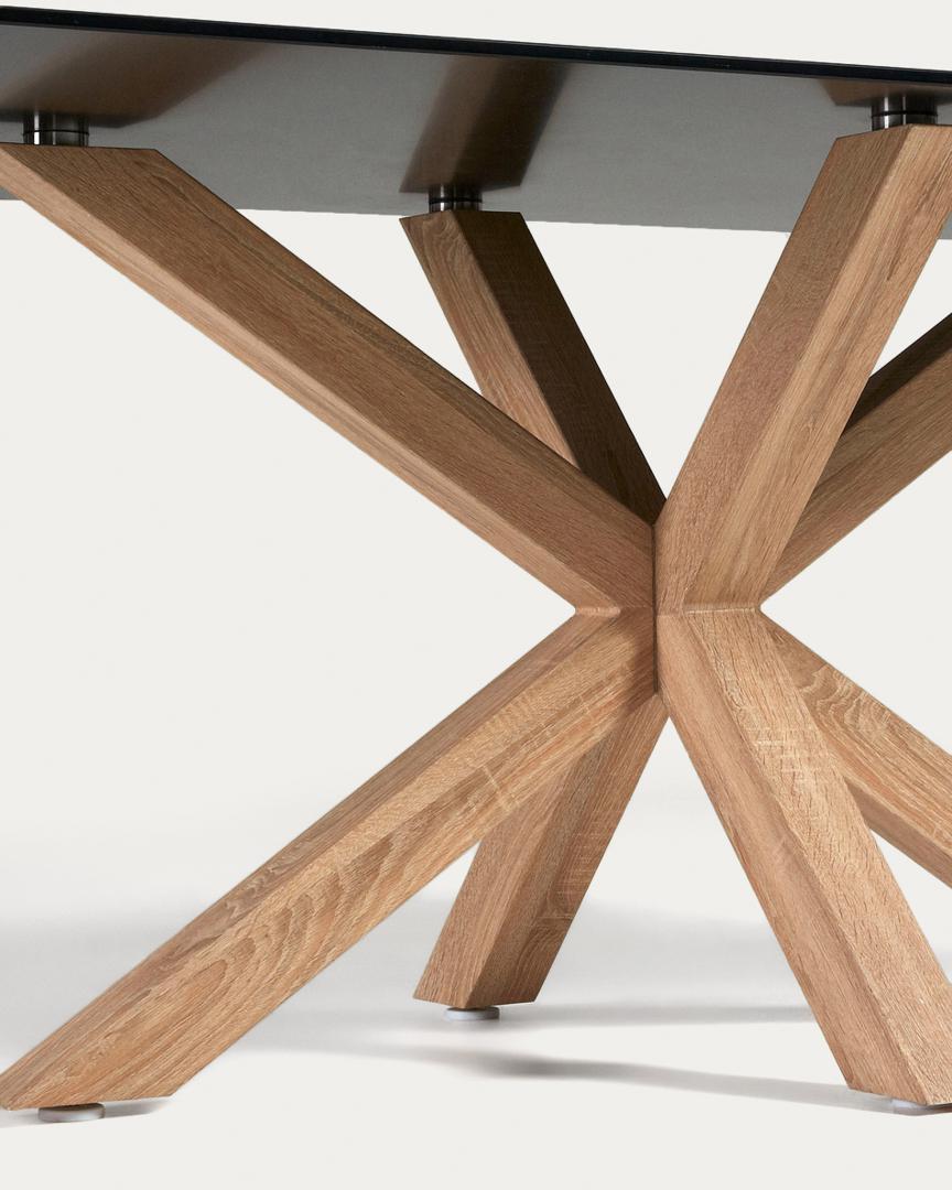Обеденный стол со стальным концом деревянного вида ног. Столешница из закаленного стекла.