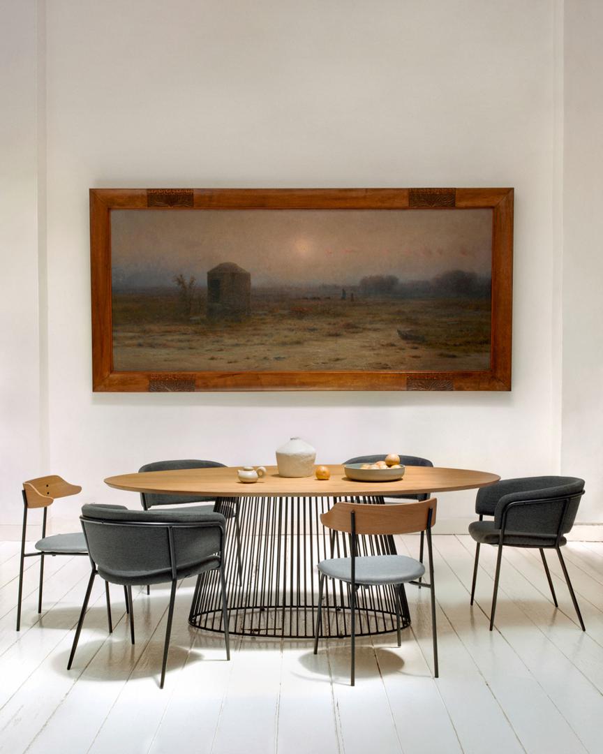 Овальный стол Leska от фабрики La Forma – модель для интерьеров, которым нужна яркая, центральная деталь. Овальный стол Leska сразу привлекает внимание своим эффектным и нетипичным дизайном. Уникальная по своей конструкции опора, бесценная древесина манго, впечатляющие габариты – все эти особенности модели сумеет оценить даже самый искушенный поклонник европейской мебели. Такой стол станет «изюминкой» в современном интерьере, не сомневайтесь. Стол овальной формы. Столешница сделана из массива дерева манго. Поверхность покрыта прозрачным полиуретаном для защиты от негативного воздействия внешней среды и сохранения натурального рисунка. Высота столешницы составляет 2,6 см. Удерживает деревянную панель металлическая стойка, состоящая из прутьев диаметром 0,8 см. Внизу прутья приверны к опоре, имеющей также форму овала (длина 114 см и ширина 59 см). Прочность металла обеспечивает стойкость к высоким весовым нагрузкам (максимально допустимая – 40 кг), а покрытие черной эпоксидной краской – защиту от влаги. Стол рассчитан на посадку из 8 человек. Размеры: длина – 200 см, ширина – 110 см, высота – 76 см. Вес изделия составляет 48 кг. Для сборки в комплектацию включена инструкция, крепеж. Во избежание повреждения поверхности столешницы рекомендуется использовать скатерти или салфетки. В коллекцию Leska также входит журнальный столик и набор из двух столиков.