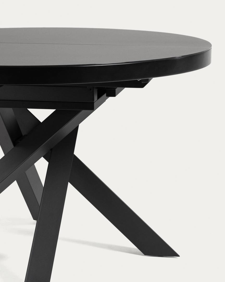 Стол раздвижной Vashti Ø 120 (160) от фабрики La Forma – стильный минимализм для небольших гостиных. Раздвижной стол Vashti – это мастерски исполненная модель для современных городских интерьеров, состоящая из массы достоинств. Черный цвет выглядит ярко, а эффектная атласная стеклянная отделка защищает поверхность от отпечатков пальцев. Небольшие габариты – однозначный плюс для скромных по площади помещений. А раздвижная конструкция – возможность не отказывать себе в приеме гостей. Стол круглой формы. Столешница высотой 2 см состоит из панели МДФ и закаленного стекла с матовым черным покрытием. Стекло ударопрочное, легко очищается от загрязнений. Удерживает стол опора, состоящая из четырех скрещенных между собой прямоугольных ножек. Они сделаны из металла и покрыты черной эпоксидной краской. Такое расположение ножек позволяет чувствовать за столом себя более комфортно, так как для ног будет больше свободного пространства. А прочность металла гарантирует стойкость к высоким весовым нагрузкам (максимальный вес – 100 кг). Изделие оснащено раздвижным механизмом по типу «бабочка» – дополнительная панель извлекается из центра стола и укладывается между двух раздвинутых половинок столешницы. Стол рассчитан на посадку из 6 человек. Размеры: длина – 120-160 см, ширина – 120 см, высота – 76 см. Вес изделия составляет 75 кг. Потребуется сборка. В коллекции Vashti представлен аналогичный стол с керамическим покрытием под черный мрамор.