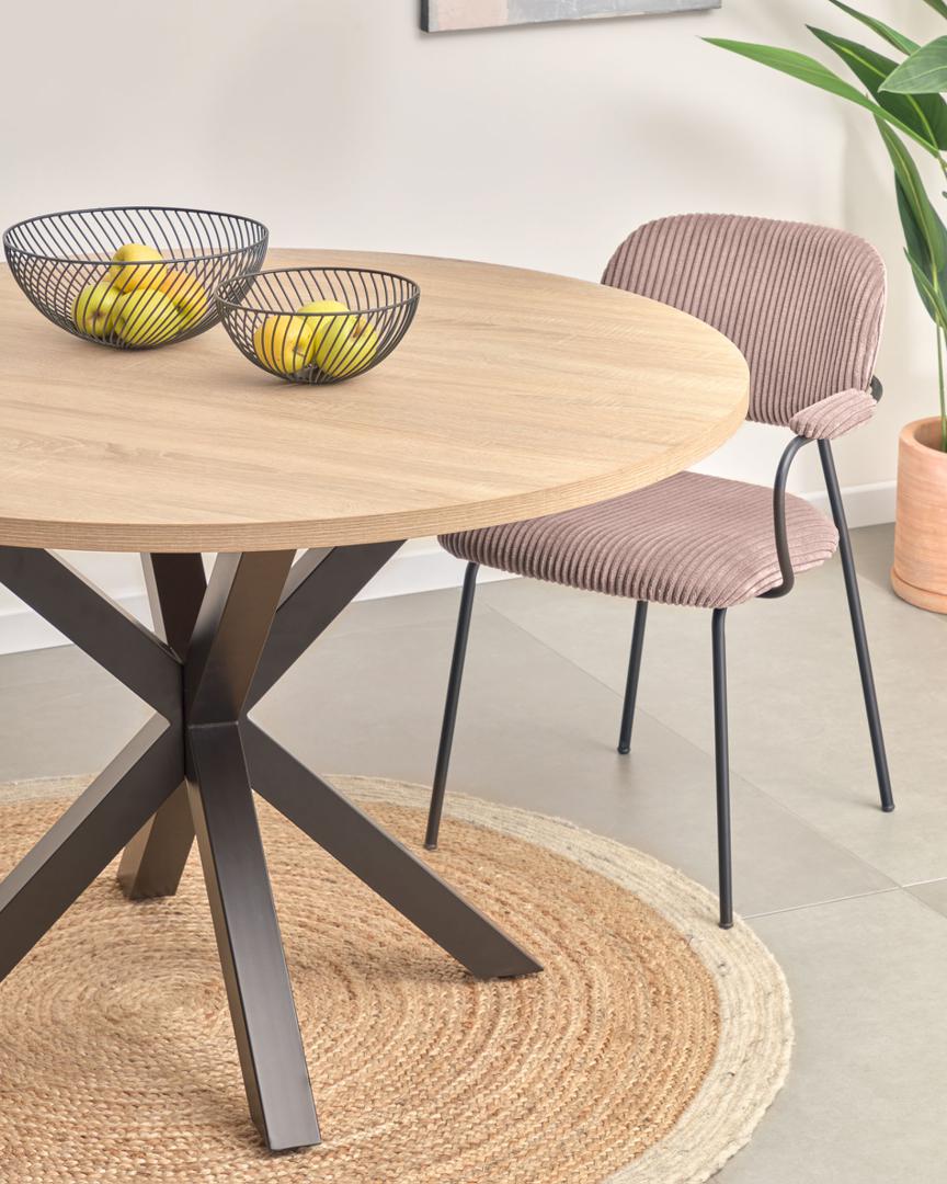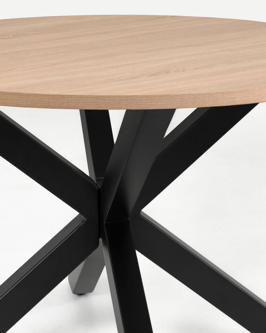 Стол Arya от фабрики La Forma (ex Julia Grup) – оригинальное совмещение цветов и материалов для стильных городских интерьеров. Круглый стол Arya идеально подойдет для стильных городских обстановок, в которых минимализм выражен ярко, а необычные детали приветствуются. Здесь на контрасте представлена деревянная столешница и черные металлические ножки. Сочетание непривычное, но яркое и эффектное. Его стоит попробовать. Особенно, если это дизайнерская модель из самой Испании! Стол круглый, что очень удобно для любой комнаты и места расположения. Столешница сделана из прочной древесностружечной плиты и орехового шпона. Поверхность обработана меламином, который защищает ее от влаги, упрощает очистку от загрязнений. Толщина столешницы 3 см. Ножки металлические, с пластиковыми защитными накладками. Черное матовое покрытие нанесено по порошковой технологии, что обеспечивает идеально ровную поверхность. Ножки образуют опору симметричной формы с шириной шага 72 см. Толщина каждой ножки – 6 на 6 см. Максимально допустимая нагрузка на стол не должна превышать 60 кг. Вместимость – 6 человек. Размеры: ширина/ глубина столешницы – 120 см, ширина опоры – 81 см, высота – 74,5 см. Вес – 38,7 кг. Потребуется небольшая сборка. Инструкция и крепеж входят в комплектацию. Во избежание повреждения поверхности столешницы рекомендуется использовать скатерти или салфетки. В коллекцию Arya включены аналогичные круглые и прямоугольные стеклянные столы с ножками из разных материалов. Конструкция опоры у всех моделей одинаковая.