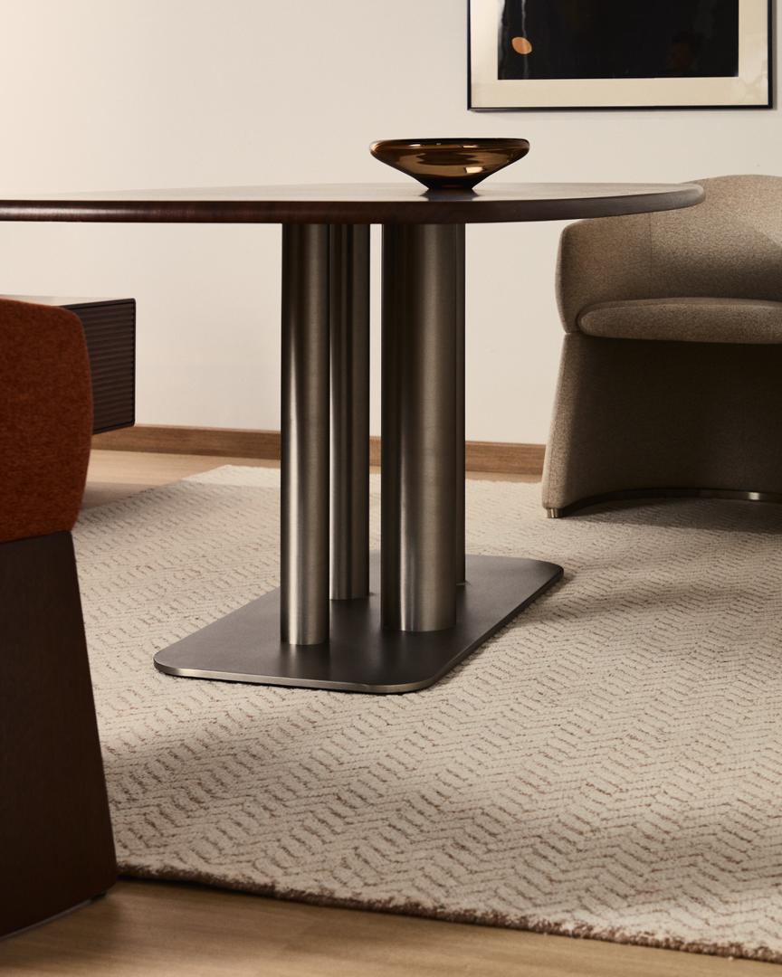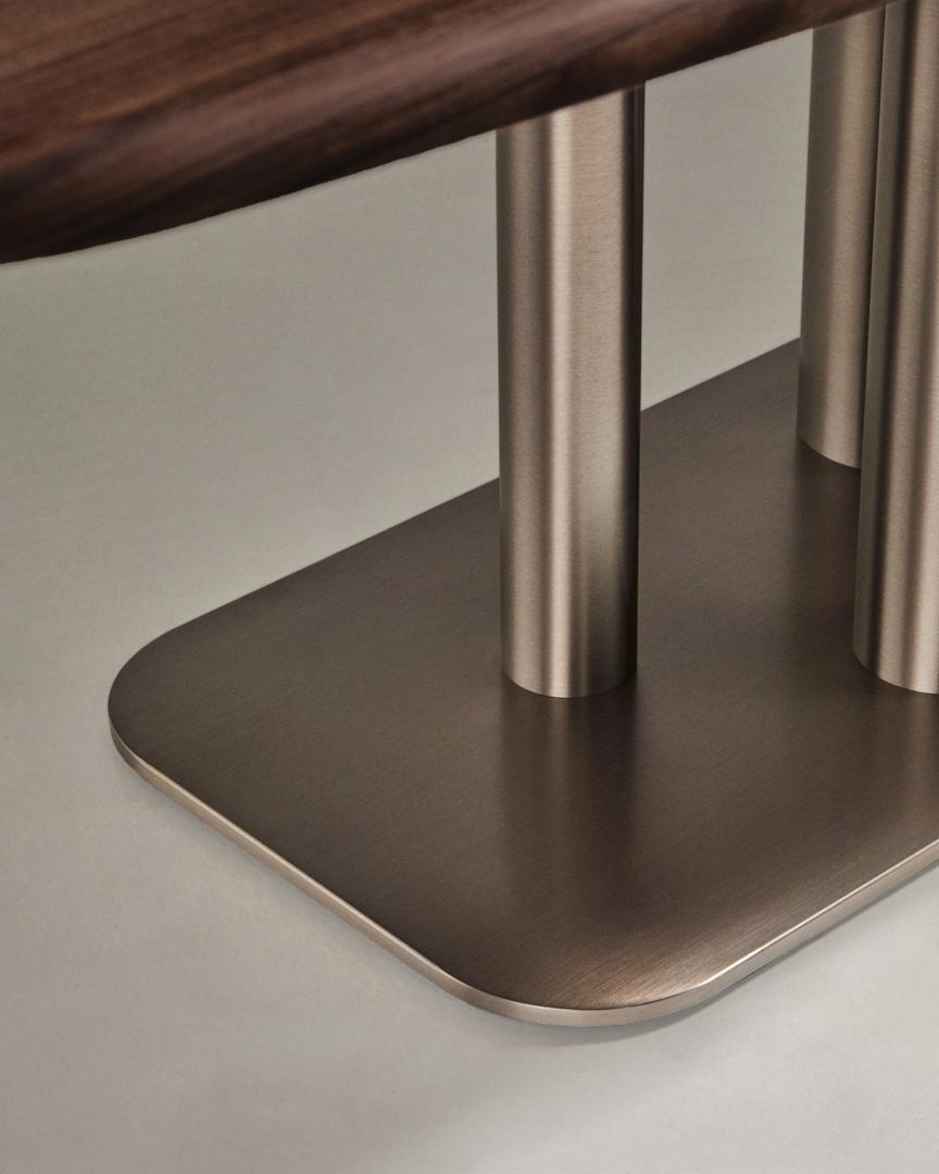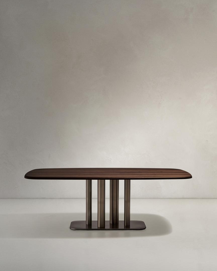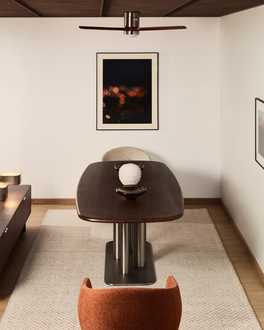 Стол Melvar – это произведение искусства, отдающее дань эстетике середины века, переосмысленной в современном стиле, где изысканность выражается в благородных материалах и скульптурных деталях. Столешница, изготовленная из орехового шпона толщиной 0,6 мм с изысканной тёмной отделкой, излучает тепло и элегантность, приглашая насладиться особыми моментами.