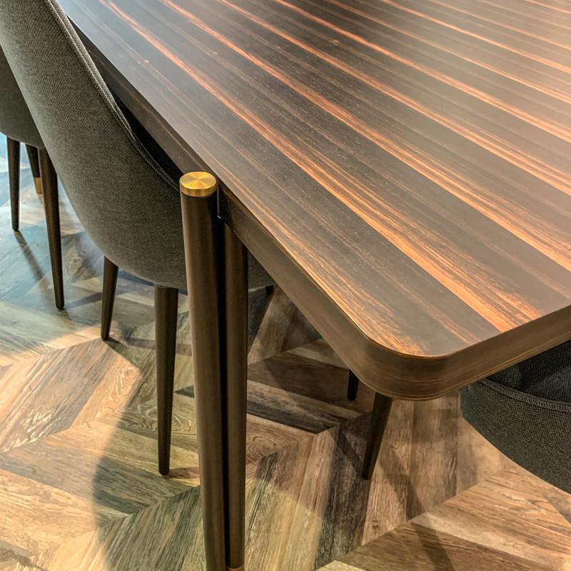 Обеденный стол от бренда Mod Interiors изготовлен из высококачественного шпонированного МДФ высокой плотности. Металлические ножки с латунными колпачками подчеркивают изысканность модели.