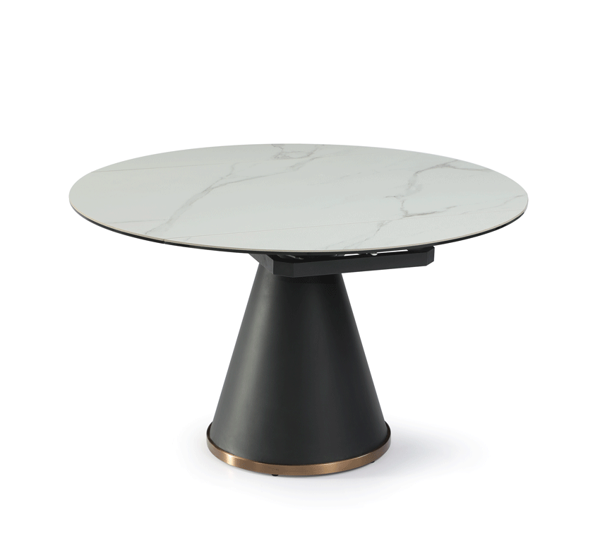 Круглый раскладной обеденный стол от бренда Mod Interiors в ультра актуальном дизайне. Столешница состоит из закаленного стекла (8 мм) нижним слоем и керамики (3 мм) бежевого цвета верхним слоем. Подстолье и нога - прочный металл с максимально стойким к внешним воздействиям порошковым покрытием черного цвета. Стол оснащен двумя боковыми вставками по 22.5 см каждая. Раскрывается стол путем легкого поворота его столешницы. Надежный механизм позволяет пользоваться данным столом долгие годы. Гарантия 24 месяца! Нижняя часть ноги стола украшена металлической лентой в цвете "розовое золото".