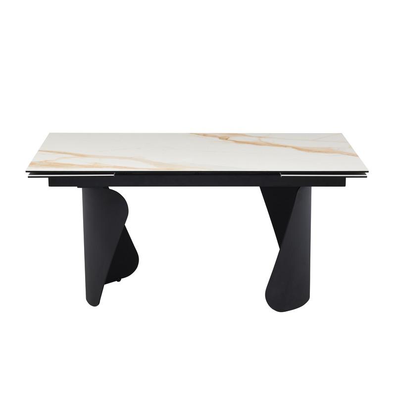 Прямоугольный раскладной обеденный стол от бренда Mod Interiors в ультра актуальном дизайне. Акцент в этой модели стола на необычной форме ног - как бы завернутые листы бумаги. Столешница состоит из закаленного стекла (8 мм) нижним слоем и керамики (3 мм) светло-бежевого с прожилками цвета верхним слоем. Подстолье и 4 ноги - прочный металл с максимально стойким к внешним воздействиям порошковым покрытием черного цвета. Стол оснащен 2-мя боковыми вставками по 40 см. Раскрывается стол путем выдвижения из под стола вставки с каждой стороны стола. Механизм очень легкий и плавный. Надежный механизм позволяет пользоваться данным столом долгие годы. Гарантия 24 месяца! Стол для комфортного размещения 8-12 человек.