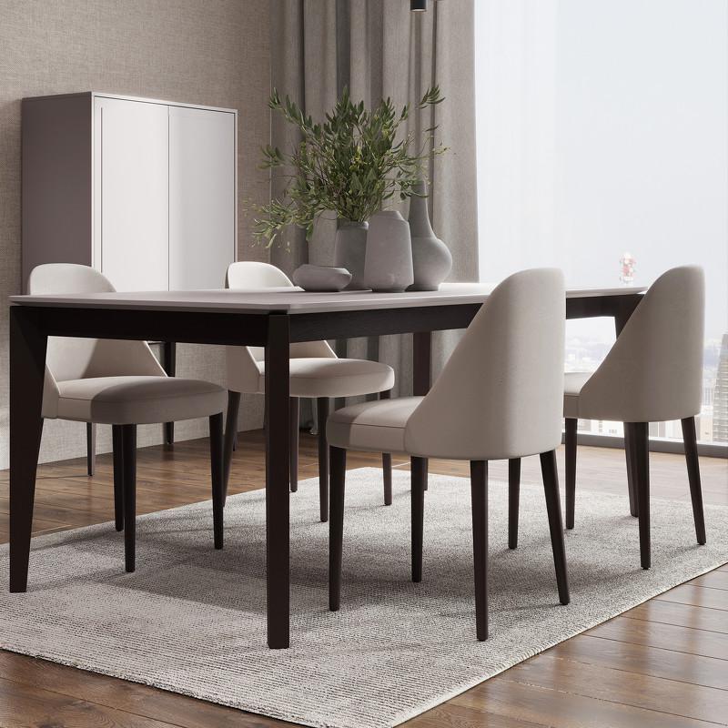 Обеденный стол на высоких ножках из коллекции Marbella от бренда MOD Interiors. Дизайнерская фрезеровка фасадов на дверце. Столешница — приятный серый матовый оттенок. Ножки из шпонированного массива березы — темно-коричневая (почти черная) древесина. Габариты 160*80 см — стол на четыре персоны, возможно размещение шести персон.