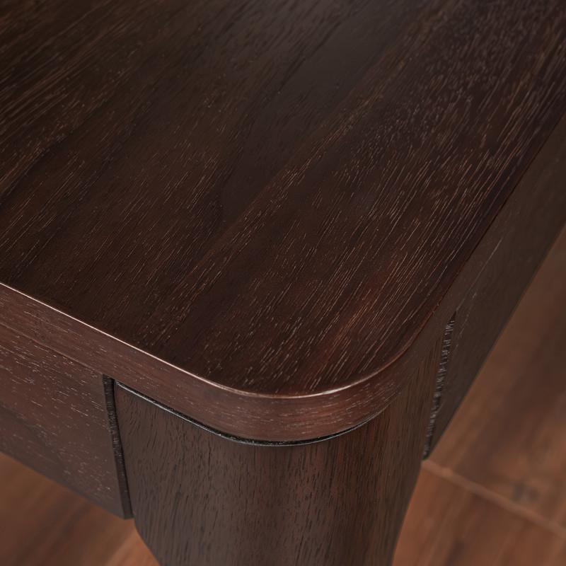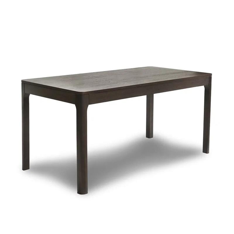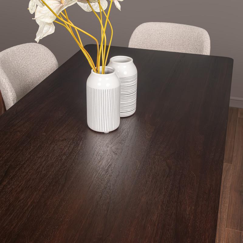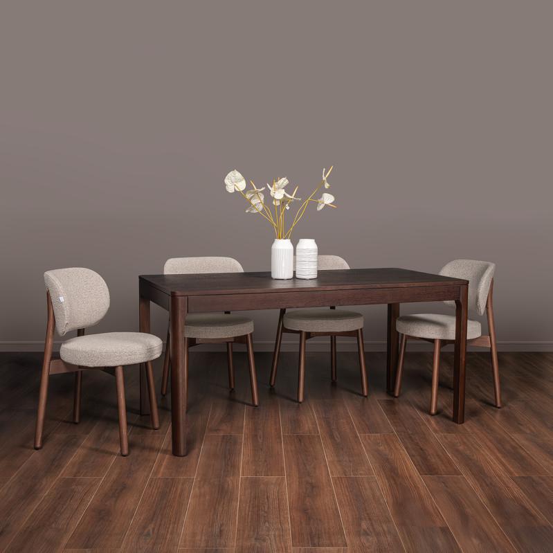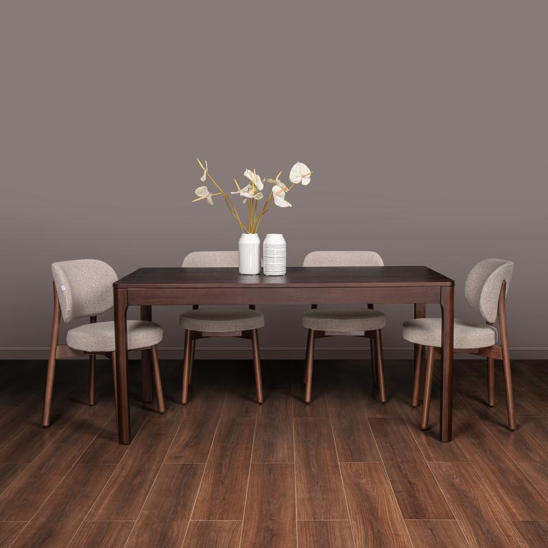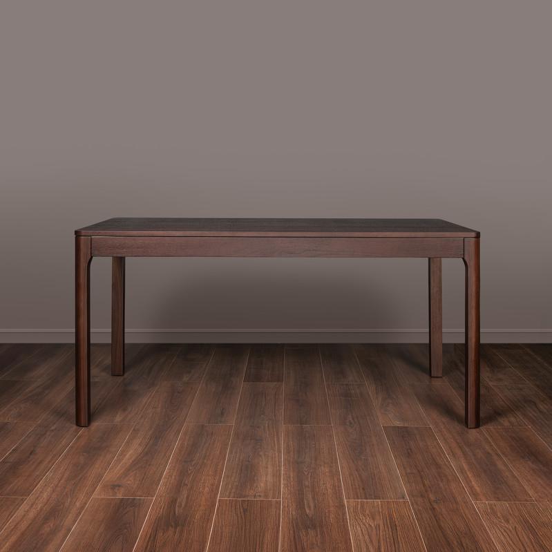 Обеденный стол бренда MOD Interiors. Столешница изготовлена из высококачественного МДФ высокой плотности, ножки из массива дерева. Отделка - натуральный шпон ореха, тонированный в цвет горького шоколада. Стол в современном стиле, подходит для просторной кухни или столовой. Закругленные углы делают стол максимально безопасным, а четыре широкие ножки очень устойчивым. Стол фиксированный, не раскладной. Стол рассчитан на комфортное размещение 6 человек.